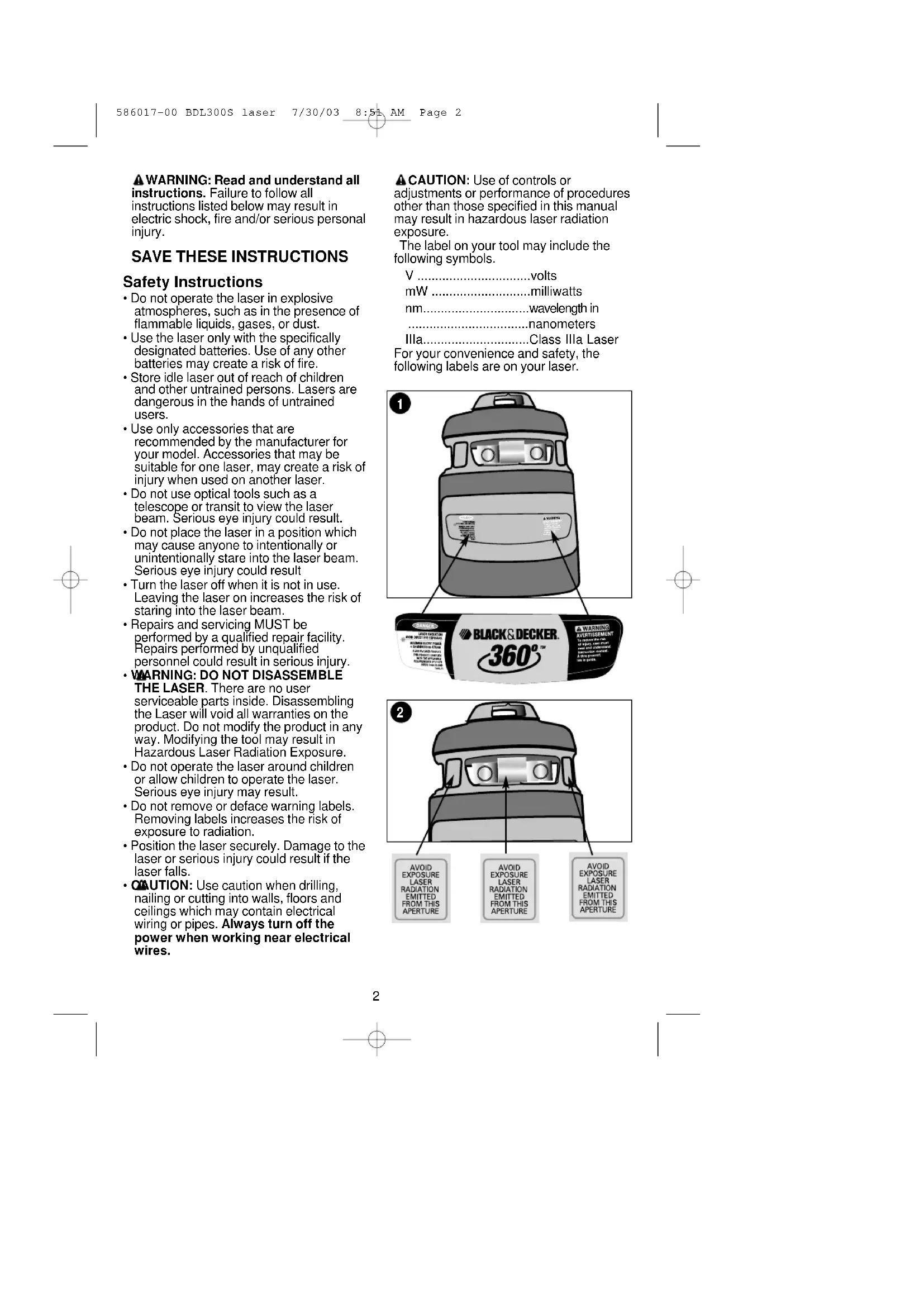 - CAUTION: Use caution when drilling, nailing or cutting into walls, floors and ceilings which may contain electrical wiring or pipes. Always turn off the power when working near electrical wires. CAUTION: Use of controls or adjustments or performance of procedures other than those specified in this manual may result in hazardous laser radiation exposure. The label on your tool may include the following symbols. V ................................volts mW ............................milliwatts nm..............................wavelength in ..................................nanometers IIIa..............................Class IIIa Laser For your convenience and safety, the following labels are on your laser.