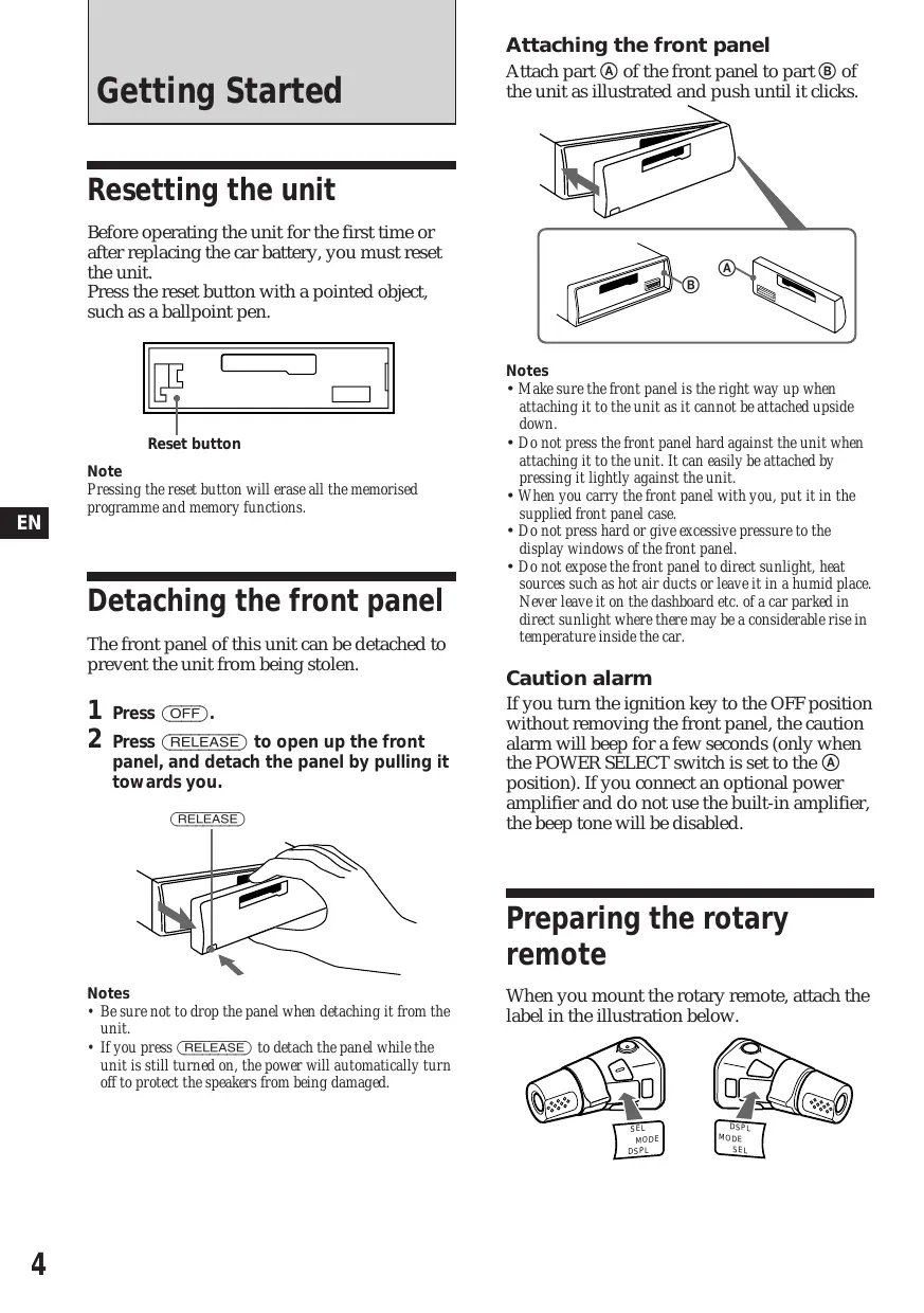 Getting Started Resetting the unit Detaching the front panel Preparing the rotary remote Setting the clock