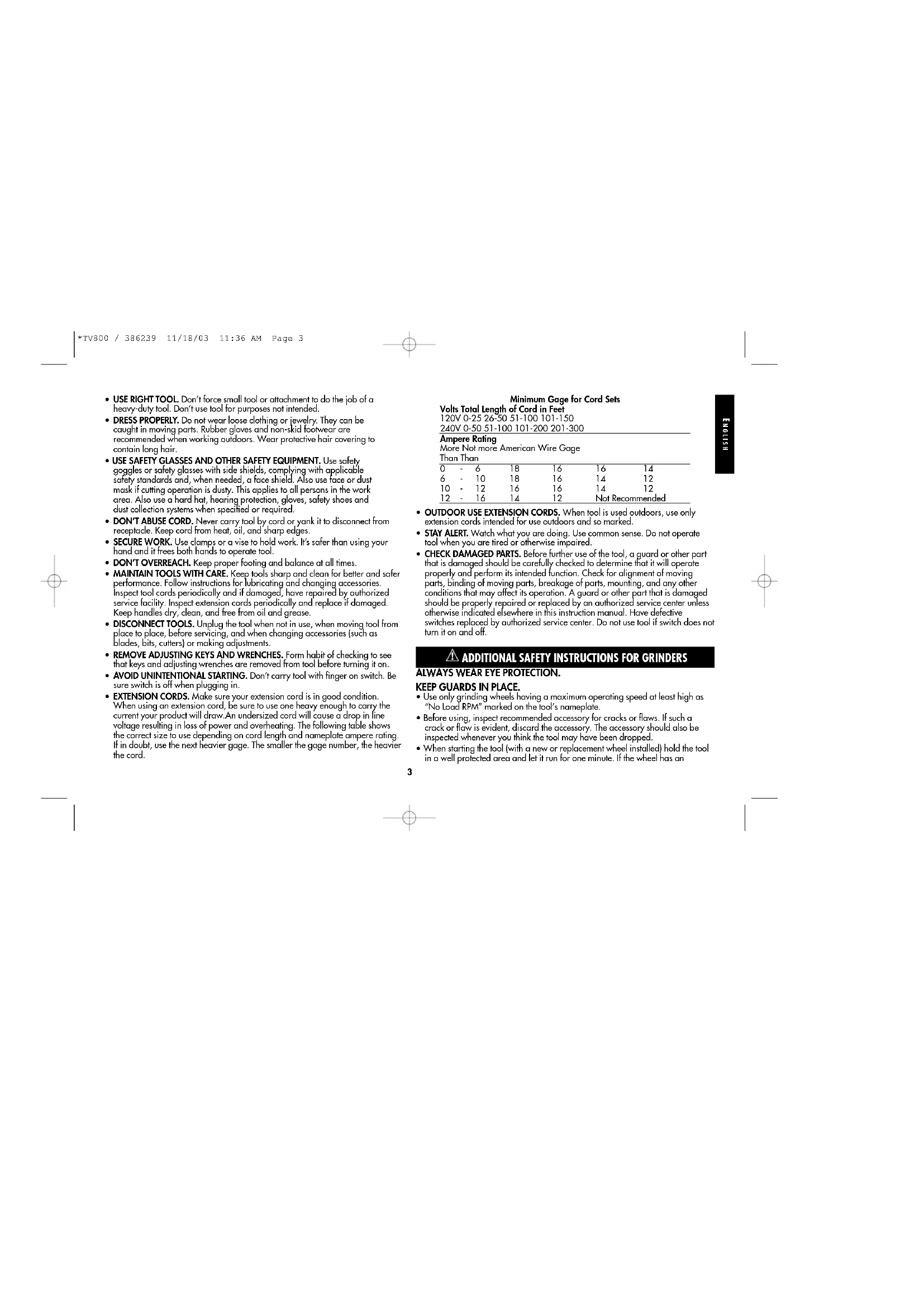 E NGLISH *TV800 / 386239 11/18/03 11:36 AM Page 34 E NGLISH undetected crack or flaw, it should burst in less than one minute. Never start the tool with a person in line with the wheel. This includes the operator.