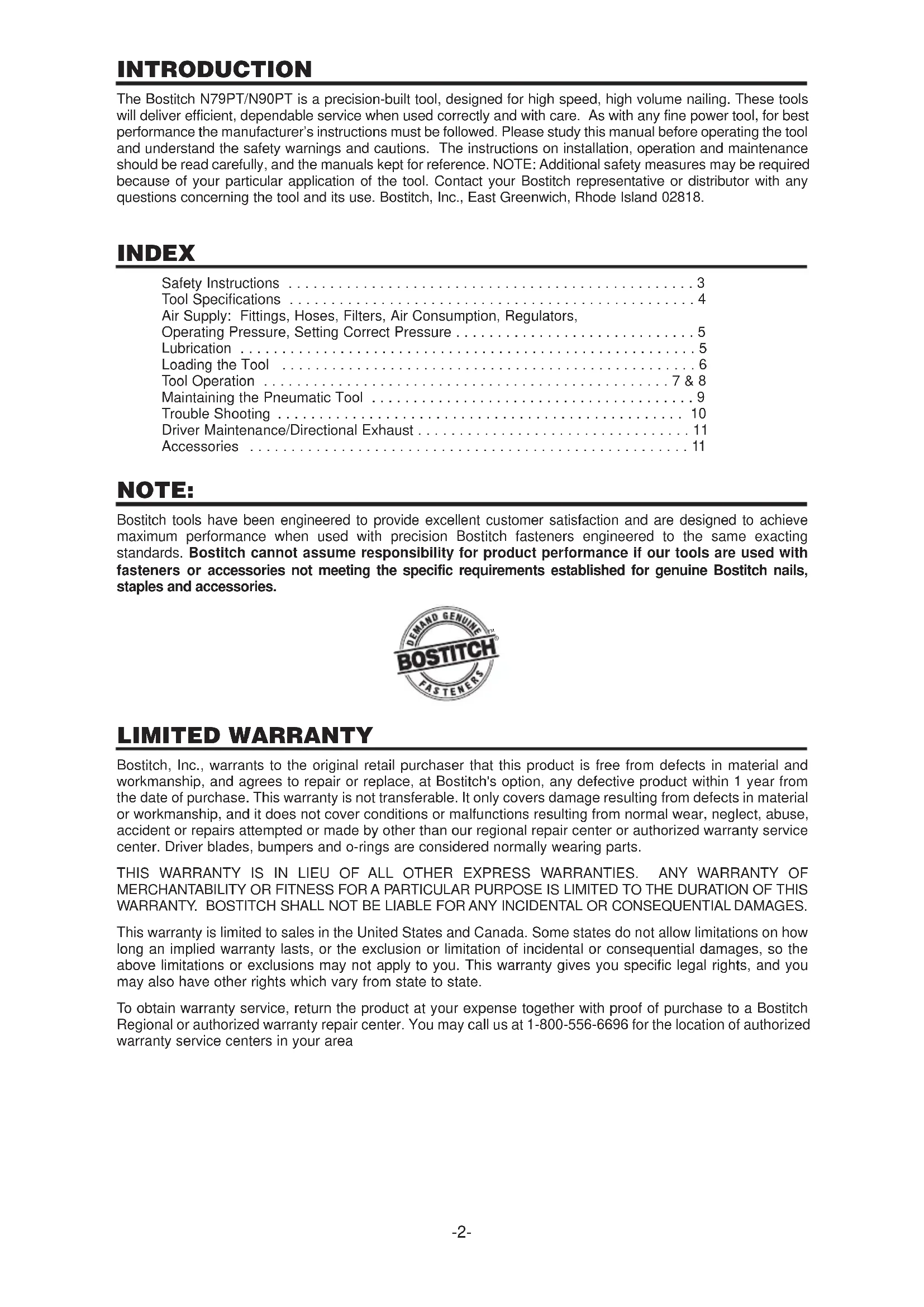 - INTRODUCTION The Bostitch N79PT/N90PT is a precision-built tool, designed for high speed, high volume nailing. These tools will deliver efficient, dependable service when used correctly and with care. As with any fine power tool, for best performance the manufacturer’s instructions must be followed. Please study this manual before operating the tool and understand the safety warnings and cautions. The instructions on installation, operation and maintenance should be read carefully, and the manuals kept for reference. NOTE: Additional safety measures may be required because of your particular application of the tool. Contact your Bostitch representative or distributor with any questions concerning the tool and its use. Bostitch, Inc., East Greenwich, Rhode Island 02818. INDEX Safety Instructions p. 3