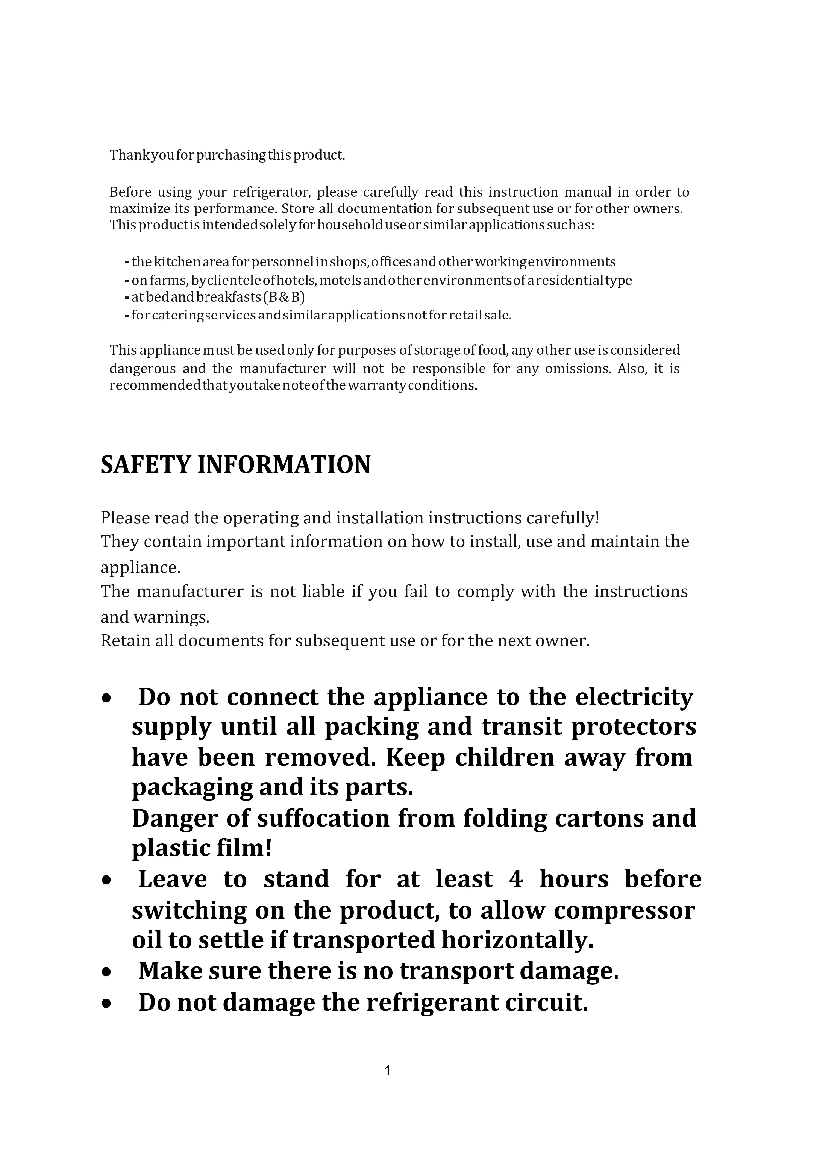 his appliance must be used only for purposes of storage of food, any other use is considered dangerous and the manufacturer will not be responsible for any omissions. Also, it is recommended that you take note of the warranty conditions. SAFETY INFORMATION Please read the operating and installation instructions carefully! They contain important information on how to install, use and maintain the appliance. The manufacturer is not liable if you fail to comply with the instructions and warnings. Retain all documents for subsequent use or for the next owner.