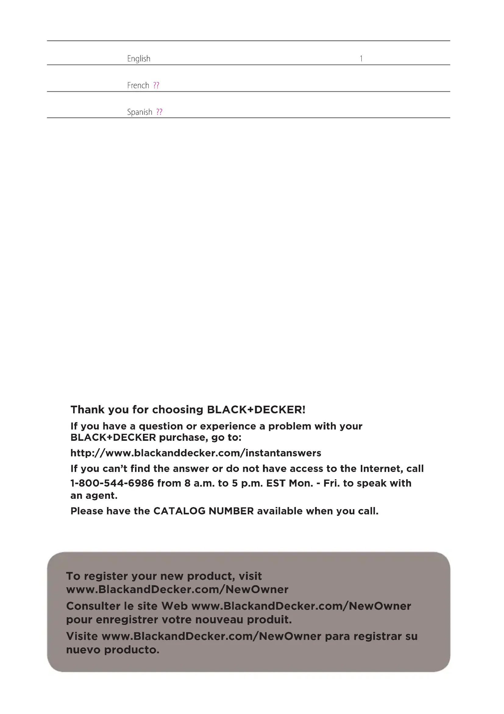 BLACK+DECKER warrants this product to be free from defects in material or workmanship for a period of two (2) years following the date of purchase, provided that the product is used in a home environment. This limited warranty does not cover failures due to abuse, accidental damage or when repairs have been made or attempted by anyone other than BLACK+DECKER and its Authorized Service Centers. A defective product meeting the guarantee conditions set forth herein will be replaced or repaired at no charge in either of two ways: Send the product (prepaid) to a BLACK+DECKER owned or authorized Service Center for repair or replacement at BLACK+DECKER’s option. Proof of purchase may be required. BLACK+DECKER owned and authorized service centers are listed online at www.blackanddecker.com. This warranty does not apply to accessories. This warranty gives you specific legal rights and you may have other rights which vary from state to state or province to province. Should you have any questions, contact the manager of your nearest BLACK+DECKER Service Center. This product is not intended for commercial use, and accordingly, such commercial use of this product will void this warranty. All other warranties, express or implied, are hereby disclaimed. LATIN AMERICA: This warranty does not apply to products sold in Latin America. For products sold in Latin America, check country specific warranty information contained in the packaging, call the local company or see the website for such information. FREE WARNING LABEL REPLACEMENT: If your warning labels become illegible or are missing, call 1-800-544- 6986 for a free replacement.ENGLISH