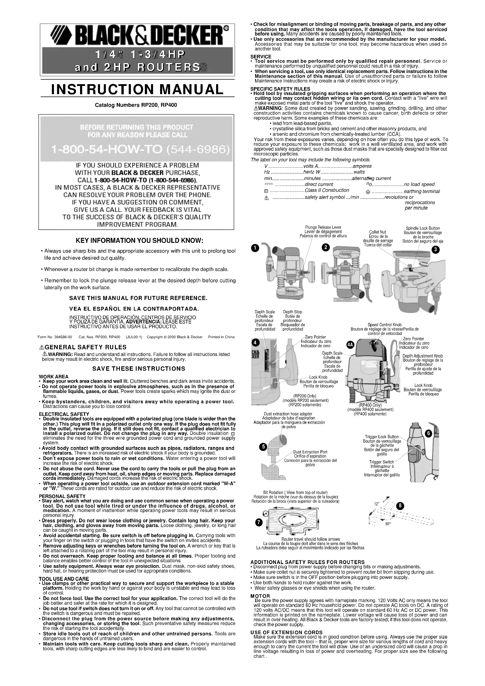 - Always use sharp bits and the appropriate accessory with this unit to prolong toollife and achieve desired cut quality. • Whenever a router bit change is made remember to recalibrate the depth scale.• Remember to lock the plunge release lever at the desired depth before cuttinglaterally on the work surface.VEA EL ESPAÑOL EN LA CONTRAPORTADA.SAVE THIS MANUAL FOR FUTURE REFERENCE.INSTRUCTIVO DE OPERACIÓN, CENTROS DE SERVICIO Y PÓLIZADE GARANTÍA. ADVERTENCIA: LÉASE ESTE INSTRUCTIVO ANTES DE USAR EL PRODUCTO. INSTRUCTION MANUAL Catalog Numbers RP200, RP400 Form No. 394586-00 Cat. Nos. RP200, RP400 (JUL00-1) Copyright © 2000 Black & Decker Printed in China
