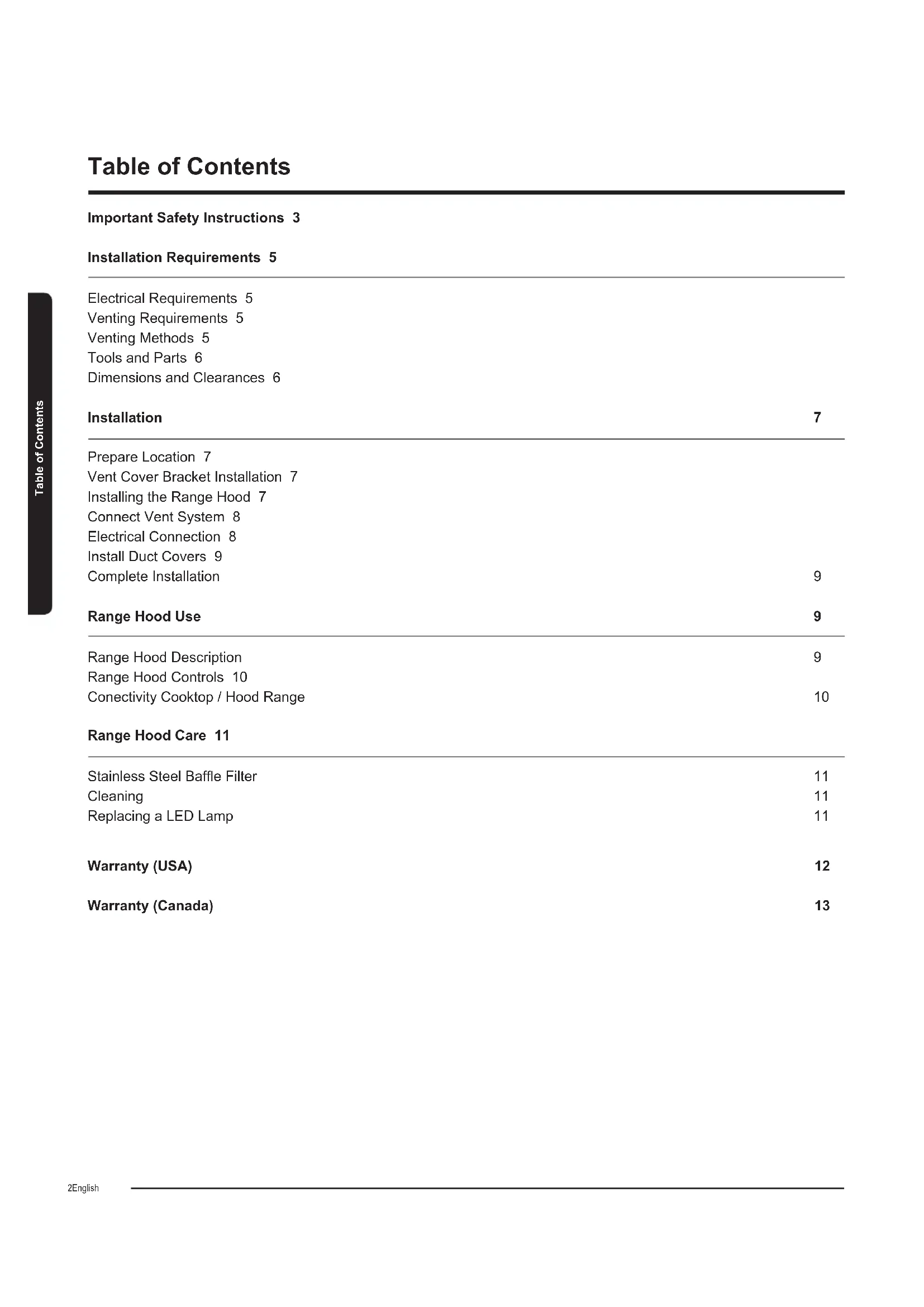 WARNING To reduce the risk of re or electrical shock, do not use this fan with any solid-state speed control device. This hood is suitable for mounting over gas ranges with a maximum power of 59,000 BTU’s only. WARNING Do not let children near this appliance. Do not let children play with this appliance. Keep all packaging materials out of children’s reach. Properly dispose the packaging materials after this appliance is unpacked. Important Safety Instructions Read and save these InstructionsEnglish 5 Electrical Requirements IMPORTANT Observe all governing codes and ordinances. It is the customer’s responsibility: To contact a qualied electrical installer. To assure that the electrical installation is adequate and in conformance with National Electrical Code, ANSI/NFPA 70 — latest edition*, or CSA Standards C22.1-94, Canadian Electrical Code, Part 1 and C22.2 No.0-M91 - latest edition** and all local codes and ordinances. If codes permit and a separate ground wire is used, it is recommended that a qualied electrician determine that the ground path is adequate. A copy of the above code standards can be obtained from: National Fire Protection Association 1 Batterymarch Park Quincy, MA 02169-7471 CSA International 8501 East Pleasant Valley Road Cleveland, OH 44131-5575 ■ A 120 volt, 60 Hz., AC only, 15-amp, fused electrical circuit is required. ■ If the house has aluminum wiring, follow the procedure below: