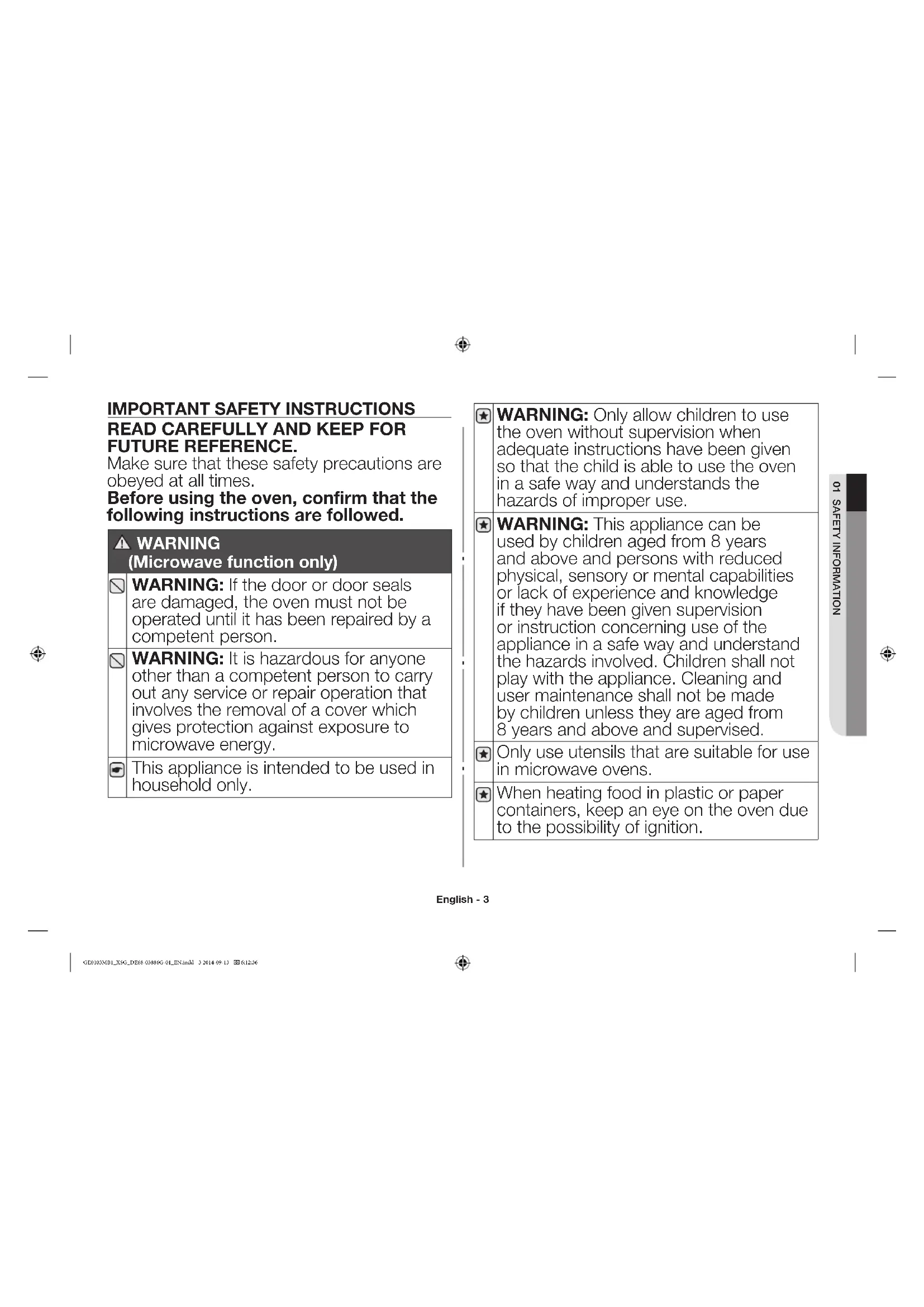 used by children aged from 8 years and above and persons with reduced physical, sensory or mental capabilities or lack of experience and knowledge if they have been given supervision or instruction concerning use of the appliance in a safe way and understand the hazards involved. Children shall not play with the appliance. Cleaning and user maintenance shall not be made by children unless they are aged from 8years and above and supervised. Only use utensils that are suitable for use in microwave ovens. When heating food in plastic or paper containers, keep an eye on the oven due to the possibility of ignition. GE0103MB1_XSG_DE68-03886G-01_EN.indd 3 2014-09-13 6:12:36English - 4 Failure to maintain the oven in a clean condition could lead to deterioration of the surface that could adversely aect the life of the appliance and possibly result in a hazardous situation. The appliance is not intended for installing in road vehicles, caravans and similar vehicles etc. This appliance is not intended for use by persons (including children) with reduced physical, sensory or mental capabilities, or lack of experience and knowledge, unless they have been given supervision or instruction concerning use of the appliance by a person responsible for their safety. Children should be supervised to ensure that they do not play with the appliance. If the supply cord is damaged, it must be replaced by the manufacturer, its service agent or similarly qualified persons in order to avoid a hazard.
