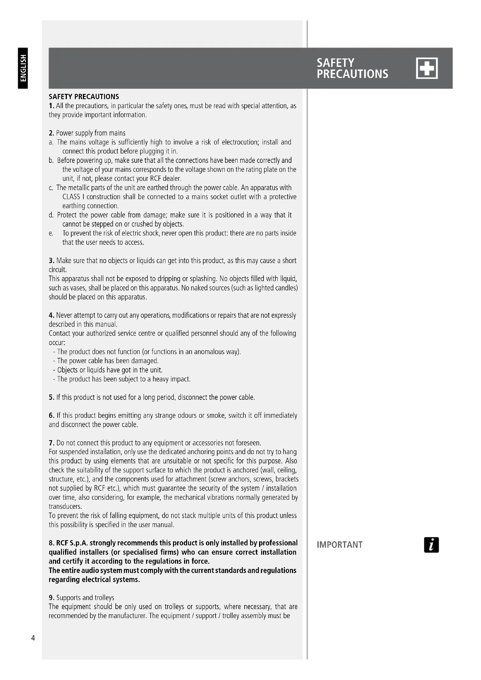 Exposure to high sound levels can cause permanent hearing loss. The acoustic pressure level that leads to hearing loss is different from person to person and depends on the duration of exposure. To prevent potentially dangerous exposure to high levels of acoustic pressure, anyone who is exposed to these levels should use adequate protection devices. When a transducer capable of producing high sound levels is being used, it is therefore necessary to wear ear plugs or protective earphones. See the manual technical specifications to know the maximum sound pressure level. IMPORTANT NOTES To prevent the occurrence of noise on line signal cables, use screened cables only and avoid putting them close to: - Equipment that produces high-intensity electromagnetic fields - Power cables - Loudspeaker lines. OPERATING PRECAUTIONS - Place this product far from any heat sources and always ensure an adequate air circulation around it. - Do not overload this product for a long time. - Never force the control elements (keys, knobs, etc. ). - Do not use solvents, alcohol, benzene or other volatile substances for cleaning the external parts of this product. IMPORTANT NOTES Before connecting and using this product, please read this instruction manual carefully and keep it on hand for future reference. The manual is to be considered an integral part of this product and must accompany it when it changes ownership as a reference for correct installation and use as well as for the safety precautions. RCF S.p.A. will not assume any responsibility for the incorrect installation and / or use of this product.