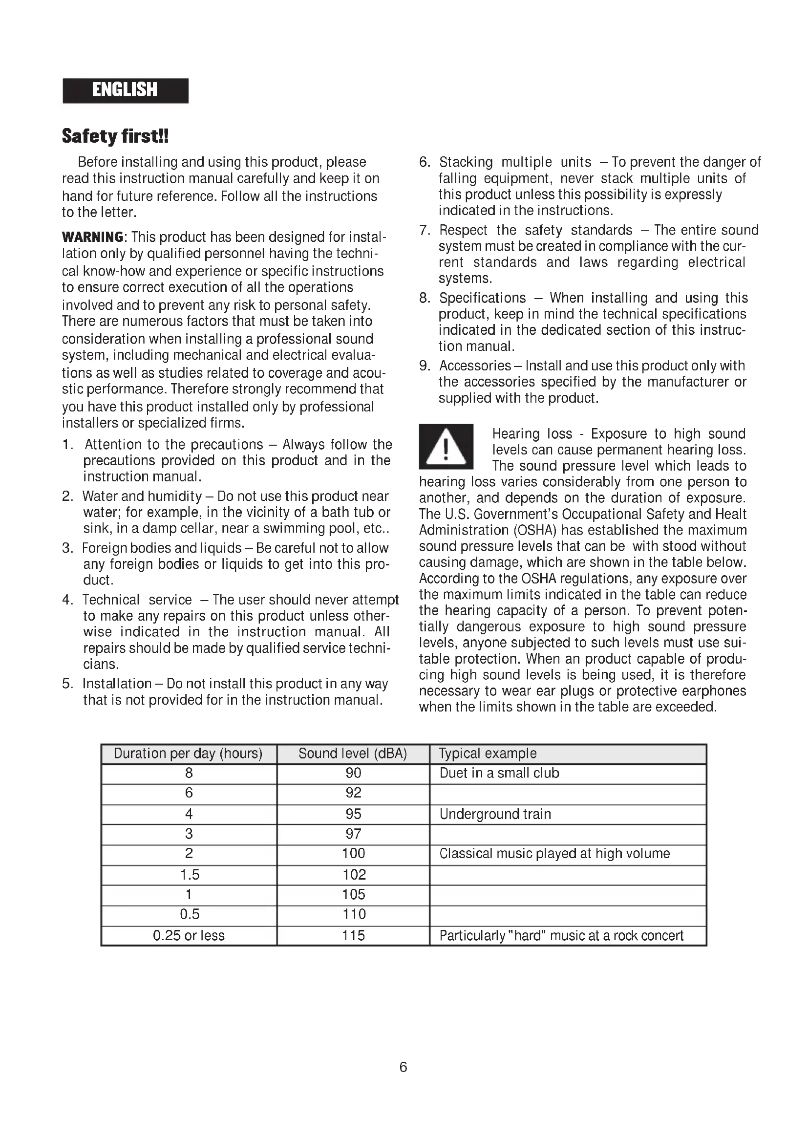 the accessories specified by the manufacturer or supplied with the product. Hearing loss - Exposure to high sound levels can cause permanent hearing loss. The sound pressure level which leads to hearing loss varies considerably from one person to another, and depends on the duration of exposure. The U.S. Government’s Occupational Safety and Healt Administration (OSHA) has established the maximum sound pressure levels that can be with stood without causing damage, which are shown in the table below. According to the OSHA regulations, any exposure over the maximum limits indicated in the table can reduce the hearing capacity of a person. To prevent poten- tially dangerous exposure to high sound pressure levels, anyone subjected to such levels must use sui- table protection. When an product capable of produ- cing high sound levels is being used, it is therefore necessary to wear ear plugs or protective earphones when the limits shown in the table are exceeded. Duration per day (hours) Sound level (dBA) Typical example 8 90 Duet in a small club