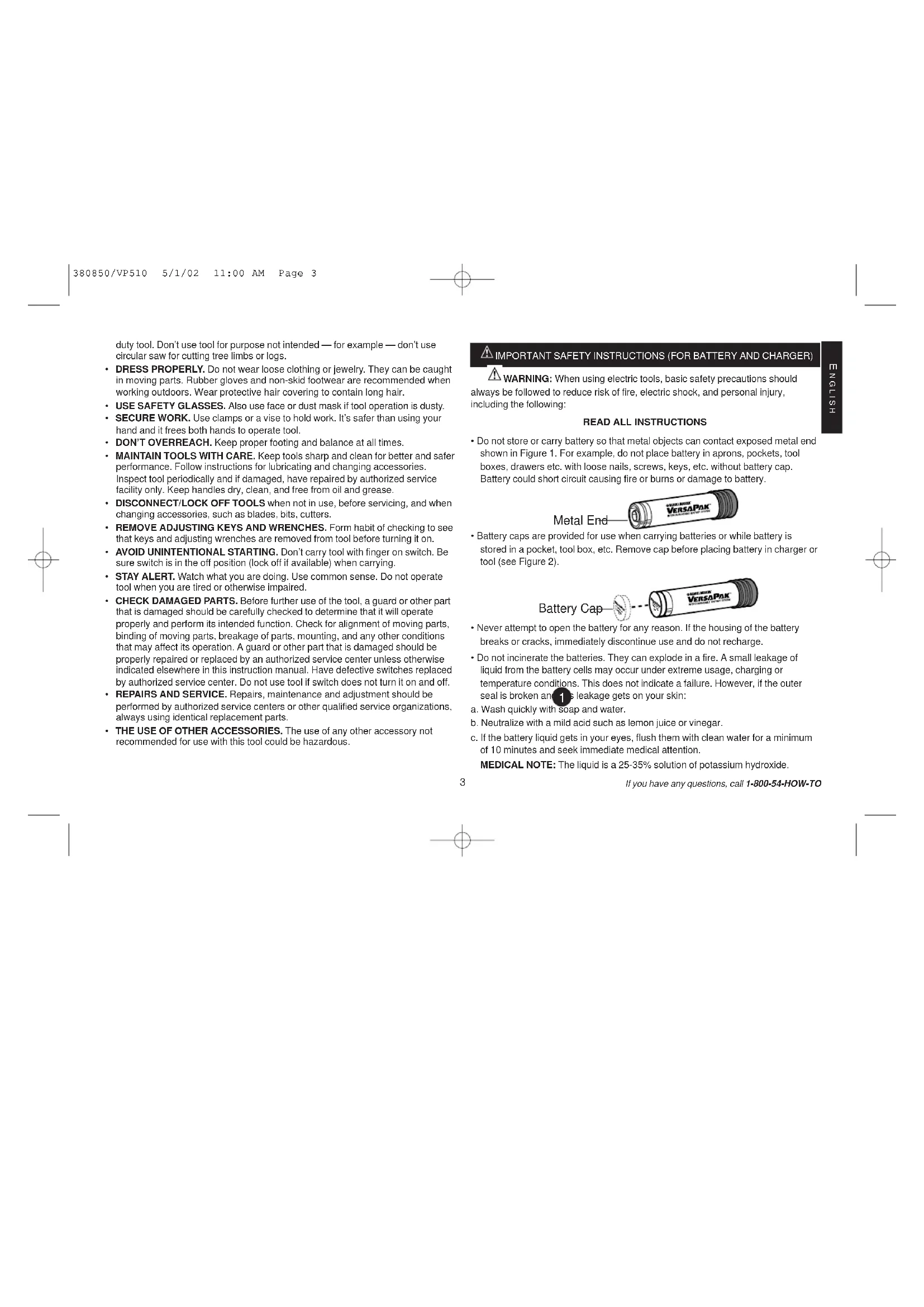 - Do not incinerate the batteries. They can explode in a fire. A small leakage of liquid from the battery cells may occur under extreme usage, charging or temperature conditions. This does not indicate a failure. However, if the outer seal is broken and this leakage gets on your skin: a. Wash quickly with soap and water. b. Neutralize with a mild acid such as lemon juice or vinegar. c. If the battery liquid gets in your eyes, flush them with clean water for a minimum of 10 minutes and seek immediate medical attention. MEDICAL NOTE: The liquid is a 25-35% solution of potassium hydroxide. STORAGE &CARRYING CAP STORAGE &CARRYING CAP Battery Cap Metal End If you have any questions, call 1-800-54-HOW-TO E NGLISH