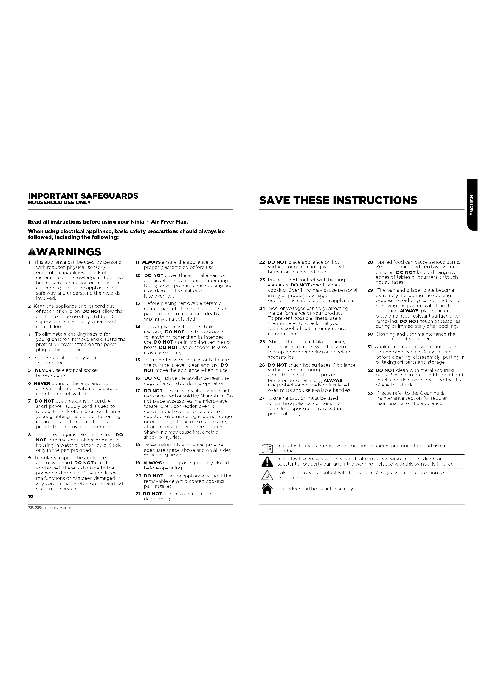 ninjakitchen.eu Scan QR code using mobile device This marking indicates this product should not be disposed of with other household wastes throughout the EU. To prevent possible harm to the environment or human health from uncontrolled waste disposal, recycle it responsibly to promote the sustainable reuse of material sources. To return your used device, please use the return and collection systems or contact the retailer where this product was purchased. They can take this product for environmentally safe recycling.ENGLISH 35 36ninjakitchen.eu IMPORTANT SAFEGUARDS