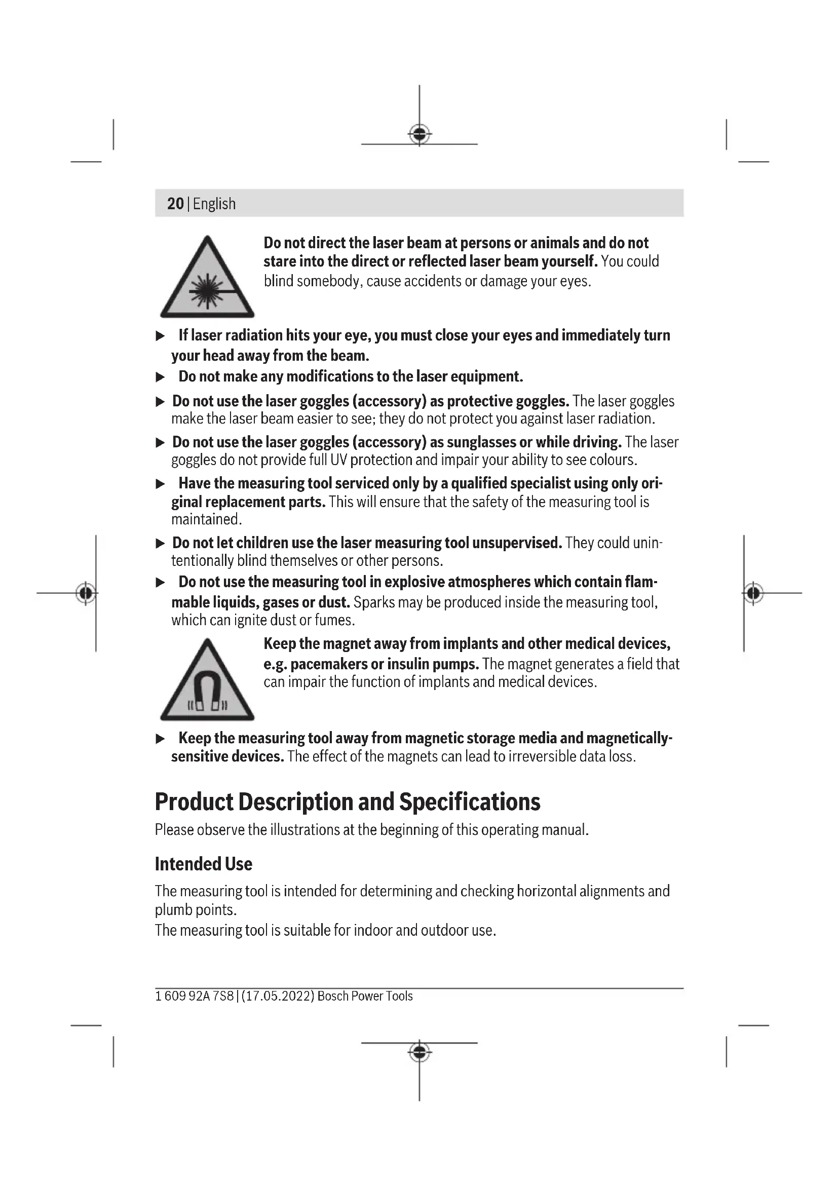 At 20–25°C C) The values stated presuppose normal to favourable environmental conditions (e.g. no vibration, no fog, no smoke, no direct sunlight). Extreme fluctuations in temperature can cause deviations in accuracy. D) Only non-conductive deposits occur, whereby occasional temporary conductivity caused by condensation is expected. The serial number (9) on the type plate is used to clearly identify your measuring tool. Assembly Inserting/changing the batteries It is recommended that you use alkaline manganese batteries to operate the measuring tool. If required, turn the magnetic rotating mount(3) to the side so that the battery compart- ment cover(6) is not obstructed. 1 609 92A 7S8 | (17.05.2022) Bosch Power ToolsEnglish | 23 Press the locking mechanism (5) upwards to open the battery compartment cover (6) and remove the battery compartment cover. Insert the batteries. When inserting the batteries, ensure that the polarity is correct according to the illustra- tion on the inside of the battery compartment. Reattach the battery compartment cover(6) and press it firmly into place at the marked point above the locking mechanism(5). If the batteries are running low, the laser points will gradually become dimmer. If the batteries are almost empty, the laser points will flash 5 times every minute. If the batteries are empty, the laser points will flash once before the measuring tool switches off. Always replace all the batteries at the same time. Only use batteries from the same man- ufacturer and which have the same capacity. u Take the batteries out of the measuring tool when you are not using it for a pro- longed period of time. The batteries can corrode and self-discharge during pro- longed storage in the measuring tool. Operation Starting Operation u Protect the measuring tool from moisture and direct sunlight. u Do not expose the measuring tool to any extreme temperatures or fluctuations in temperature. For example, do not leave it in a car for extended periods of time. If it has been subjected to significant fluctuations in temperature, first allow the measur- ing tool to adjust to the ambient temperature and then always carry out an accuracy check before continuing work (see "Accuracy Check of the Measuring Tool", page25). The precision of the measuring tool may be compromised if exposed to extreme tem- peratures or fluctuations in temperature. u Avoid substantial knocks to the measuring tool and avoid dropping it. Always carry out an accuracy check before continuing work if the measuring tool has been subjected to severe external influences (see "Accuracy Check of the Measuring Tool", page25). u Switch the measuring tool off when transporting it. The pendulum unit is locked when the tool is switched off, as it can otherwise be damaged by big movements. Bosch Power Tools 1 609 92A 7S8 | (17.05.2022)24 | English Switching On/Off To switch on the measuring tool, slide the on/off switch (2) to the ON position. As soon as it is switched on, the measuring tool emits laser beams from the outlet apertures (1). u Do not direct the laser beam at persons or animals and do not stare into the laser beam yourself (even from a distance). To switch off the measuring tool, slide the on/off switch (2) to the OFF position. The pendulum unit is locked when the tool is switched off. u Never leave the measuring tool unattended when switched on, and ensure the measuring tool is switched off after use. Others may be blinded by the laser beam. If the maximum permitted operating temperature of 45 °C is exceeded, the tool shuts down to protect the laser diode. Once it has cooled down, the measuring tool is opera- tional again and can be switched back on. Automatic shut-off The measuring tool automatically switches itself off after 60min of operation. If the switched on measuring tool is not within the self-levelling range (the laser points flash continuously), the automatic shut-off is reset to 60min. Automatic Levelling Position the measuring tool on a level, firm support or attach it to a tripod(11). To use the bottom laser point, rotate the measuring tool on the magnetic rotating mount(3) in such a manner that the laser point can be seen on the floor. After switching on, the automatic levelling function automatically compensates irregular- ities within the self-levelling range of ±4°. The levelling is finished as soon as the laser points light up continuously (i.e. no longer flashing) and do not move any more. If automatic levelling is not possible, e.g. because the surface on which the measuring tool stands deviates by more than4° from the horizontal plane, the laser points will flash continuously and quickly. If this is the case, set up the measuring tool in a level position and wait for the self-level- ling to take place. As soon as the measuring tool is within the self-levelling range of ±4°, the laser points will light up continuously. In case of ground vibrations or position changes during operation, the measuring tool is automatically levelled again. After each levelling process, check the position of the hori- zontal and/or vertical laser points in relation to the reference points to avoid errors arising from a change in the measuring tool's position. 1 609 92A 7S8 | (17.05.2022) Bosch Power ToolsEnglish | 25 Accuracy Check of the Measuring Tool Influences on Accuracy The largest influence is exerted by the ambient temperature. In particular, temperature differences that occur from the ground upwards can refract the laser beam. Since the temperature stratification is greatest at ground level, you should always mount the measuring tool on a tripod for measuring distances of 20m or more. In addition, pos- ition the measuring tool in the centre of the work surface, wherever this is possible. In addition to external influences, device-specific influences (e.g. falls or heavy impacts) can also lead to deviations. For this reason, check the levelling accuracy each time be- fore beginning work. 