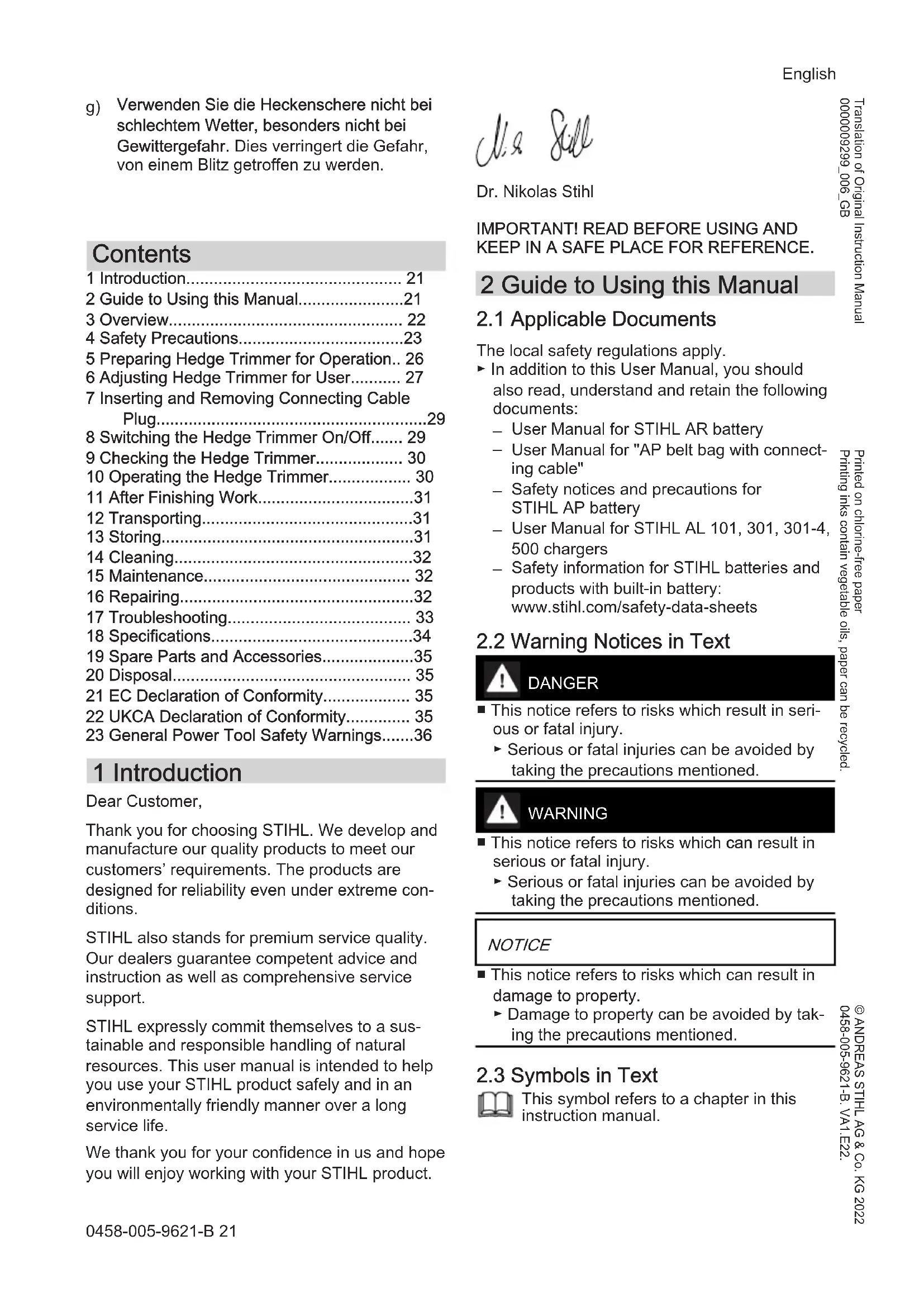 This symbol refers to a chapter in this instruction manual. English 0458-005-9621-B 21 © ANDREAS STIHL AG & Co. KG 2022 0458-005-9621-B. VA1.E22. Printed on chlorine-free paper Printing inks contain vegetable oils, paper can be recycled. Translation of Original Instruction Manual 0000009299_006_GB3 Overview