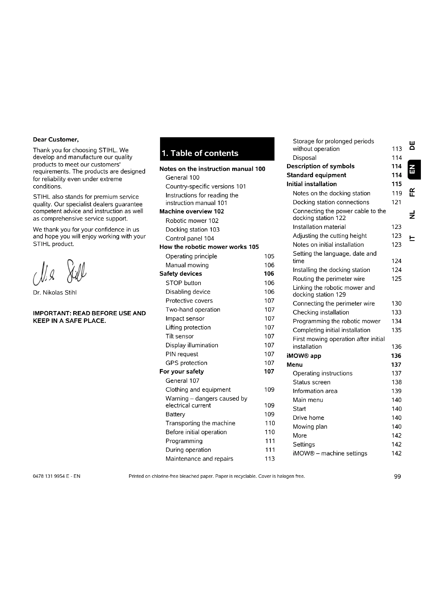 DEFRNLIT EN 0478 131 9954 E - EN Dear Customer, Thank you for choosing STIHL. We develop and manufacture our quality products to meet our customers' requirements. The products are designed for reliability even under extreme conditions. STIHL also stands for premium service quality. Our specialist dealers guarantee competent advice and instruction as well as comprehensive service support. We thank you for your confidence in us and hope you will enjoy working with your STIHL product. Dr. Nikolas Stihl