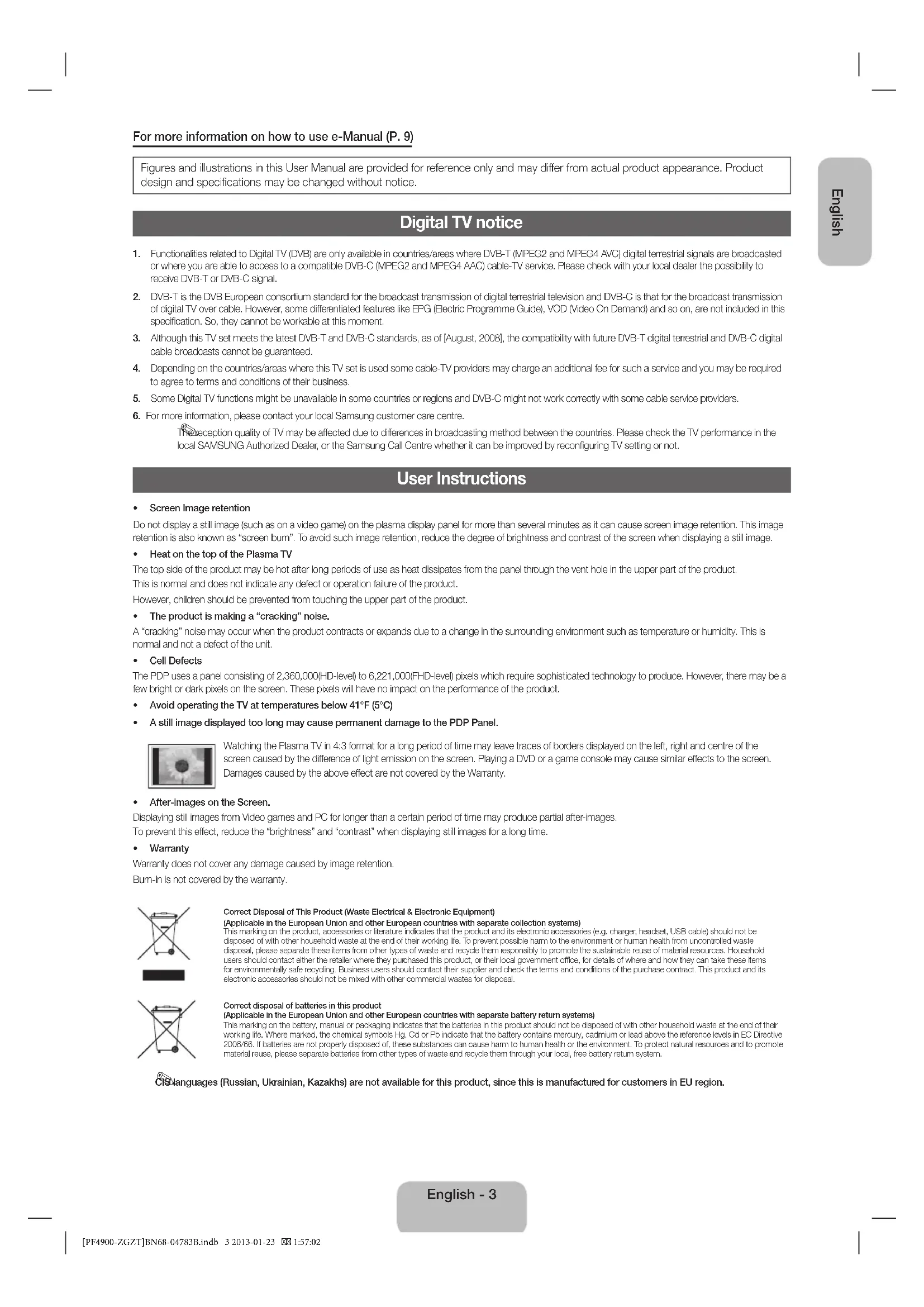 FERALLSERVICINGTOQUALIFIEDPERSONNEL. RISKOFELECTRICSHOCK.DONOTOPEN. Thissymbolindicatesthathighvoltageispresentinside.It isdangeroustomakeanykindofcontactwithanyinternal partofthisproduct. Thissymbolindicatesthatimportantliteratureconcerning operationandmaintenance hasbeenincludedwiththis product [PF4900-ZGZT]BN68-04783B.indb 2 2013-01-23 1:57:01English For more information on how to use e-Manual (P. 9) Figures and illustrations in this User Manual are provided for reference only and may differ from actual product appearance. Product design and specifications may be changed without notice. Digital TV notice 1. Functionalities related to Digital TV (DVB) are only available in countries/areas where DVB-T (MPEG2 and MPEG4 AVC) digital terrestrial signals are broadcasted or where you are able to access to a compatible DVB-C (MPEG2 and MPEG4 AAC) cable-TV service. Please check with your local dealer the possibility to receive DVB-T or DVB-C signal. 2. DVB-T is the DVB European consortium standard for the broadcast transmission of digital terrestrial television and DVB-C is that for the broadcast transmission of digital TV over cable. However, some differentiated features like EPG (Electric Programme Guide), VOD (Video On Demand) and so on, are not included in this specification. So, they cannot be workable at this moment. 3. Although this TV set meets the latest DVB-T and DVB-C standards, as of [August, 2008], the compatibility with future DVB-T digital terrestrial and DVB-C digital cable broadcasts cannot be guaranteed. 4. Depending on the countries/areas where this TV set is used some cable-TV providers may charge an additional fee for such a service and you may be required to agree to terms and conditions of their business. 5. Some Digital TV functions might be unavailable in some countries or regions and DVB-C might not work correctly with some cable service providers.