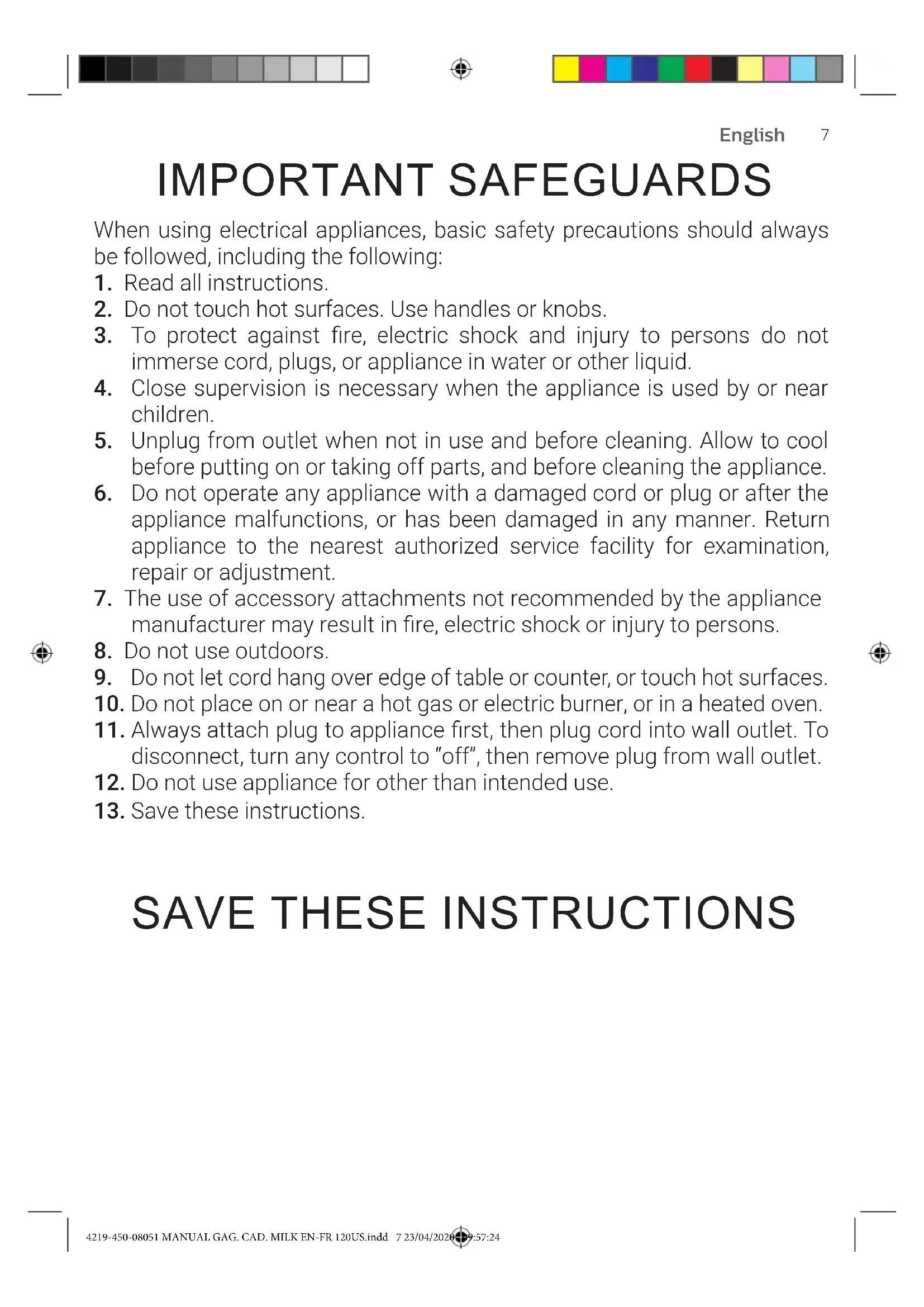 4219-450-08051 MANUAL GAG. CAD. MILK EN-FR 120US.indd 7 23/04/2020 09:57:248 English CAUTION This appliance is for household use only. Any servicing, other than cleaning and user maintenance, should be performed by an authorized service center. Do not immerse machine in water. To reduce the risk of re or electric shock, do not disassemble the machine. There are no parts inside the machine serviceable by the user. Repair should be done by authorized service personnel only.