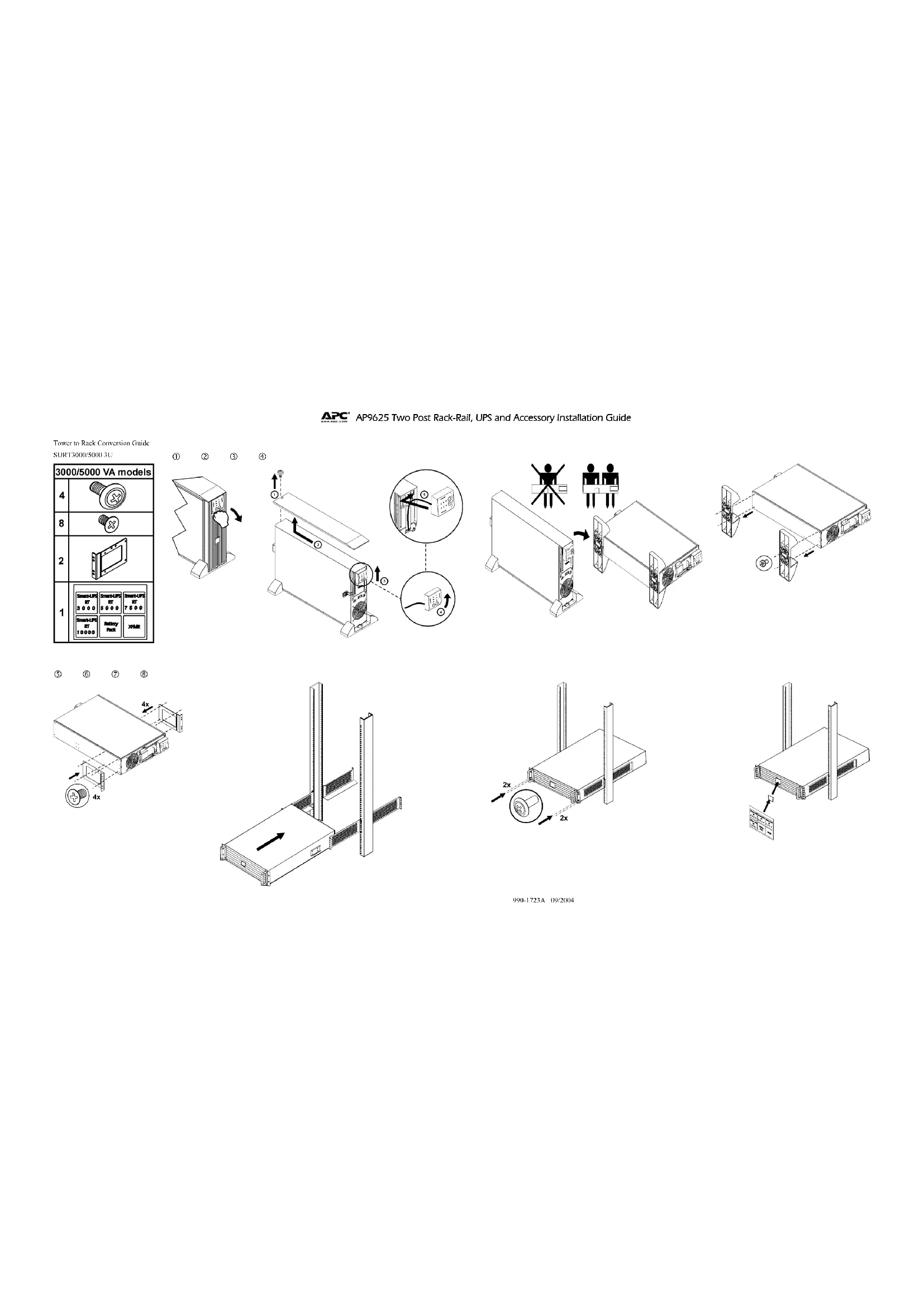 990-1723A 09/2004 AP9625 Two Post Rack-Rail, UPS and Accessory Installation Guide Tower to Rack Conversion Guide SURT7500/10000 6U