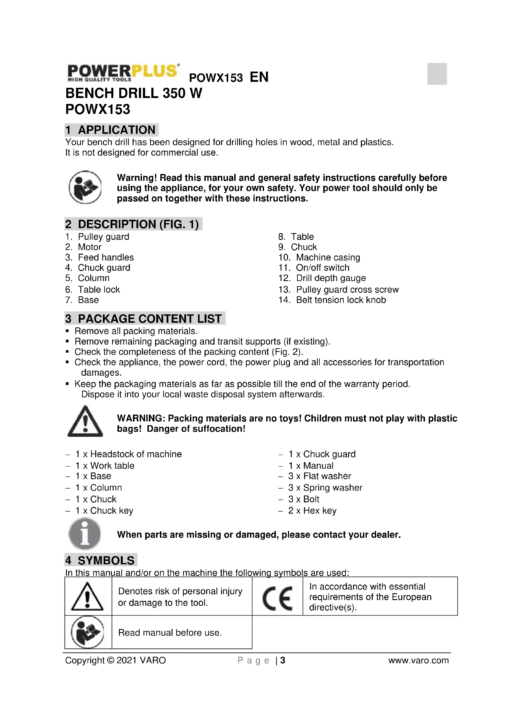 VARO N.V. -Vic. Van Rompuy N.V.- Joseph Van Instraat 9 - BE2500 Lier - BELGIUM, declares that, product: Bench drill 350 W trade mark: POWERplus model: POWX153 is in conformity with the essential requirements and other relevant provisions of the applicable European Directives, based on the application of European harmonized standards. Any unauthorized modification of the apparatus voids this declaration. European Directives (including, if applicable, their amendments up to the date of signature): 2011/65/EU 2014/30/EU 2006/42/EC European harmonized standards (including, if applicable, their amendments up to the date of signature): EN62841-1 : 2015 EN62841-3-13 : 2017 EN55014-1 : 2017 EN55014-2 : 2015 EN61000-3-2 : 2014 EN61000-3-3 : 2013 Keeper of the Technical Documentation: Philippe Vankerkhove, VARO – Vic. Van Rompuy N.V. The undersigned acts on behalf of the company CEO, Philippe Vankerkhove Regulatory Affairs – Compliance Manager 21/01/2021, Lier - BelgiumPOWX153 DE Copyright © 2021 VARO Seite | 1 www.varo.com 1 EINSATZBEREICH .......................................................................... 3