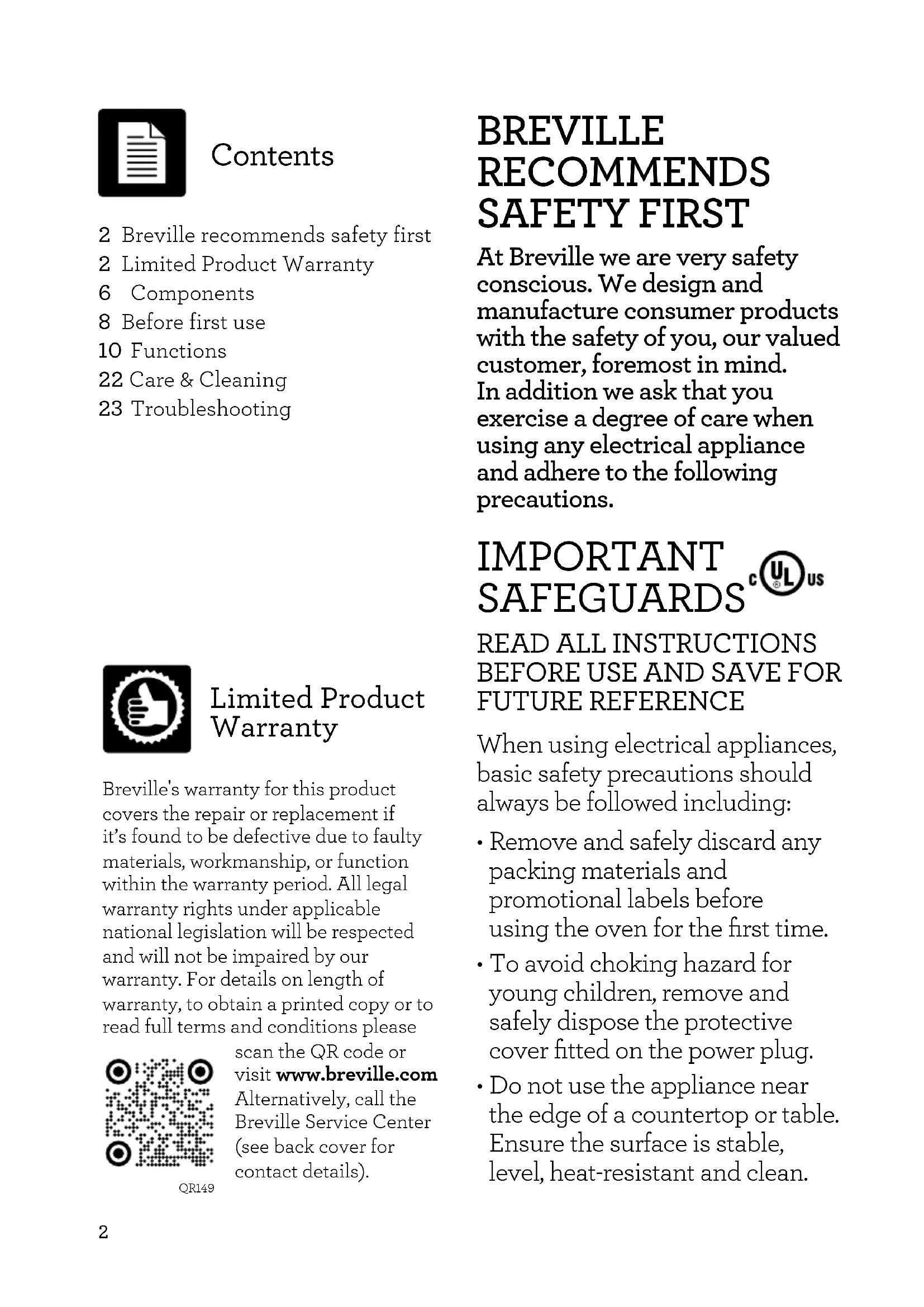 - Do not use the appliance near the edge of a countertop or table. Ensure the surface is stable, level, heat-resistant and clean. 2 Breville recommends safety first2 Limited Product Warranty6 Components8 Before first use10 Functions22 Care & Cleaning23 Troubleshooting Contents Limited Product Warranty Brevilles warranty for this product covers the repair or replacement if it’s found to be defective due to faulty materials, workmanship, or function within the warranty period. All legal warranty rights under applicable national legislation will be respected and will not be impaired by our warranty. For details on length of warranty, to obtain a printed copy or to read full terms and conditions please scan the R code or visit www.breville.com Alternatively, call the Breville Service Center (see back cover for contact details).QREN