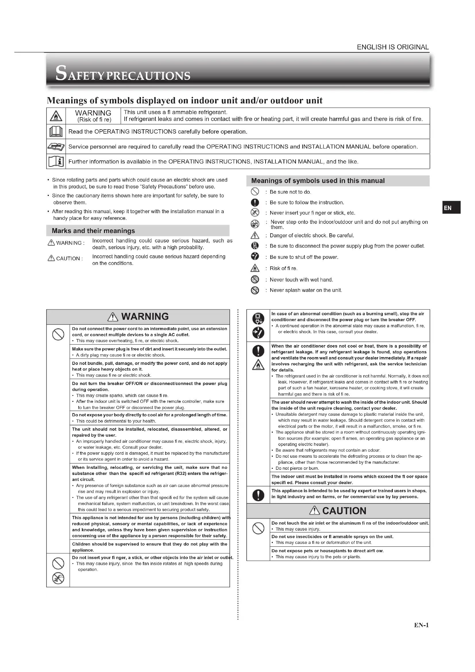 EN-1 WARNING Do not connect the power cord to an intermediate point, use an extension cord, or connect multiple devices to a single AC outlet.• This may cause overheating, fi re, or electric shock.Make sure the power plug is free of dirt and insert it securely into the outlet.• A dirty plug may cause fi re or electric shock.Do not bundle, pull, damage, or modify the power cord, and do not apply heat or place heavy objects on it.• This may cause fi re or electric shock.Do not turn the breaker OFF/ON or disconnect/connect the power plug during operation.• This may create sparks, which can cause fi re.• After the indoor unit is switched OFF with the remote controller, make sure to turn the breaker OFF or disconnect the power plug. Do not expose your body directly to cool air for a prolonged length of time.• This could be detrimental to your health.The unit should not be installed, relocated, disassembled, altered, or repaired by the user.• An improperly handled air conditioner may cause fi re, electric shock, injury, or water leakage, etc. Consult your dealer.• If the power supply cord is damaged, it must be replaced by the manufacturer or its service agent in order to avoid a hazard.When installing, relocating, or servicing the unit, make sure that no substance other than the specifi ed refrigerant (R32) enters the refriger-ant circuit.• Any presence of foreign substance such as air can cause abnormal pressure rise and may result in explosion or injury.• The use of any refrigerant other than that specifi ed for the system will cause mechanical failure, system malfunction, or unit breakdown. In the worst case, this could lead to a serious impediment to securing product safety.This appliance is not intended for use by persons (including children) with reduced physical, sensory or mental capabilities, or lack of experience and knowledge, unless they have been given supervision or instruction concerning use of the appliance by a person responsible for their safety.Children should be supervised to ensure that they do not play with the appliance. Do not insert your fi nger, a stick, or other objects into the air inlet or outlet.• This may cause injury, since the fan inside rotates at high speeds during operation.• Since rotating parts and parts which could cause an electric shock are used in this product, be sure to read these “Safety Precautions” before use.• Since the cautionary items shown here are important for safety, be sure to observe them.• After reading this manual, keep it together with the installation manual in a handy place for easy reference. Marks and their meanings WARNING :Incorrect handling could cause serious hazard, such as death, serious injury, etc. with a high probability. CAUTION :Incorrect handling could cause serious hazard depending on the conditions. In case of an abnormal condition (such as a burning smell), stop the air conditioner and disconnect the power plug or turn the breaker OFF.• A continued operation in the abnormal state may cause a malfunction, fi re, or electric shock. In this case, consult your dealer. When the air conditioner does not cool or heat, there is a possibility of refrigerant leakage. If any refrigerant leakage is found, stop operations and ventilate the room well and consult your dealer immediately. If a repair involves recharging the unit with refrigerant, ask the service technician for details.• The refrigerant used in the air conditioner is not harmful. Normally, it does not leak. However, if refrigerant leaks and comes in contact with fi re or heating part of such a fan heater, kerosene heater, or cooking stove, it will create harmful gas and there is risk of fi re.The user should never attempt to wash the inside of the indoor unit. Should the inside of the unit require cleaning, contact your dealer.• Unsuitable detergent may cause damage to plastic material inside the unit, which may result in water leakage. Should detergent come in contact with electrical parts or the motor, it will result in a malfunction, smoke, or fi re.• The appliance shall be stored in a room without continuously operating igni-tion sources (for example: open fl ames, an operating gas appliance or an operating electric heater).• Be aware that refrigerants may not contain an odour.• Do not use means to accelerate the defrosting process or to clean the ap-pliance, other than those recommended by the manufacturer.• Do not pierce or burn.The indoor unit must be installed in rooms which exceed the fl oor space specifi ed. Please consult your dealer.This appliance is intended to be used by expert or trained users in shops, in light industry and on farms, or for commercial use by lay persons. CAUTION Do not touch the air inlet or the aluminum fi ns of the indoor/outdoor unit.• This may cause injury.Do not use insecticides or fl ammable sprays on the unit.• This may cause a fi re or deformation of the unit.Do not expose pets or houseplants to direct airfl ow.• This may cause injury to the pets or plants. Meanings of symbols used in this manual : Be sure not to do. : Be sure to follow the instruction. : Never insert your fi nger or stick, etc. : Never step onto the indoor/outdoor unit and do not put anything on them. : Danger of electric shock. Be careful. : Be sure to disconnect the power supply plug from the power outlet. : Be sure to shut off the power. : Risk of fi re. : Never touch with wet hand. : Never splash water on the unit. SAFETY PRECAUTIONS Meanings of symbols displayed on indoor unit and/or outdoor unit WARNING (Risk of fi re)This unit uses a fl ammable refrigerant. If refrigerant leaks and comes in contact with fi re or heating part, it will create harmful gas and there is risk of fi re. Read the OPERATING INSTRUCTIONS carefully before operation.Service personnel are required to carefully read the OPERATING INSTRUCTIONS and INSTALLATION MANUAL before operation.Further information is available in the OPERATIN