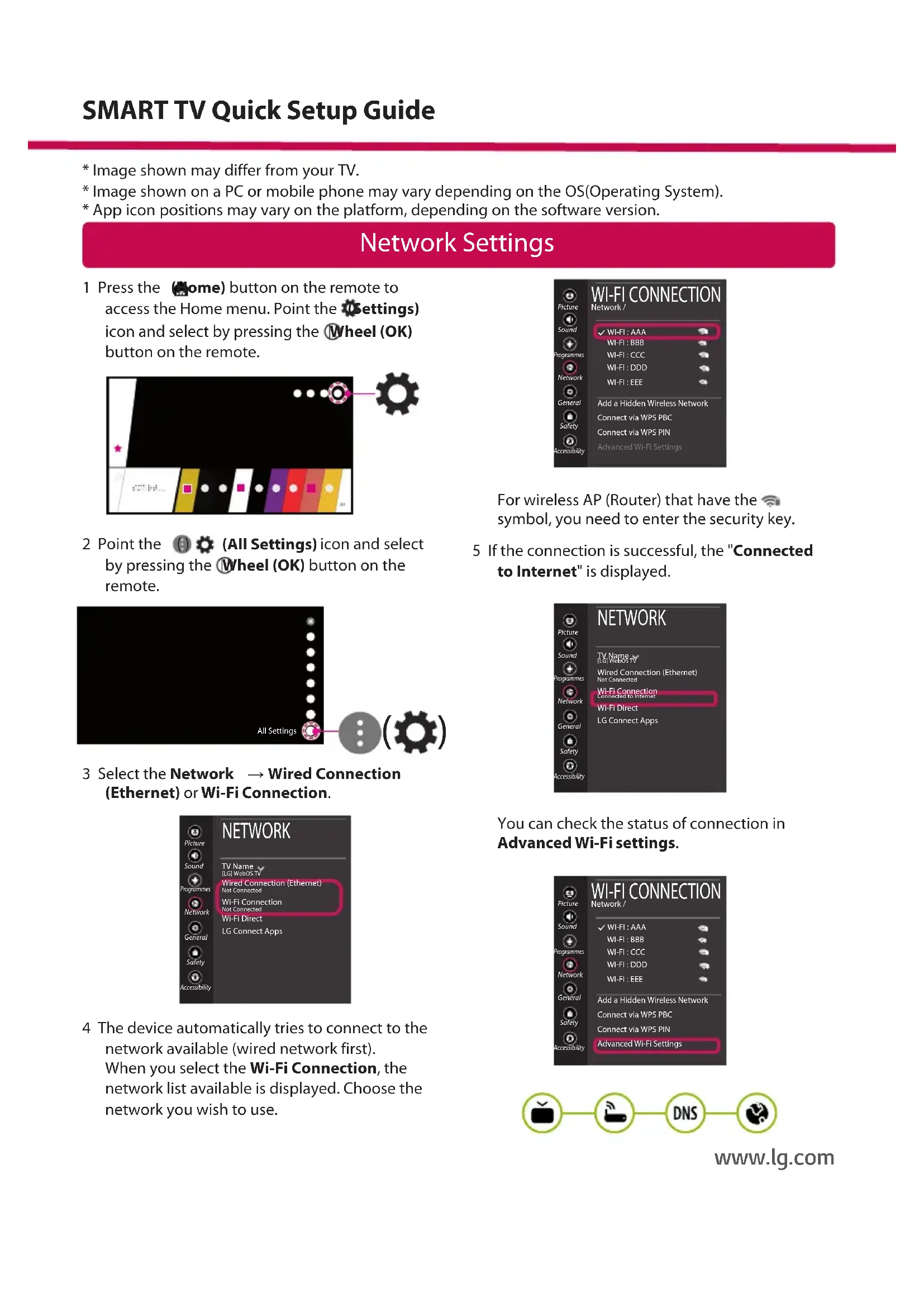 - App icon positions may vary on the platform, depending on the software version. SMART TV Quick Setup Guide www.lg.comTroubleshooting Network Problems 1 Press the (Home) button on the remote to access the Home menu. Point the (Settings) icon and select by pressing the Wheel (OK) button on the remote. 2 Point the