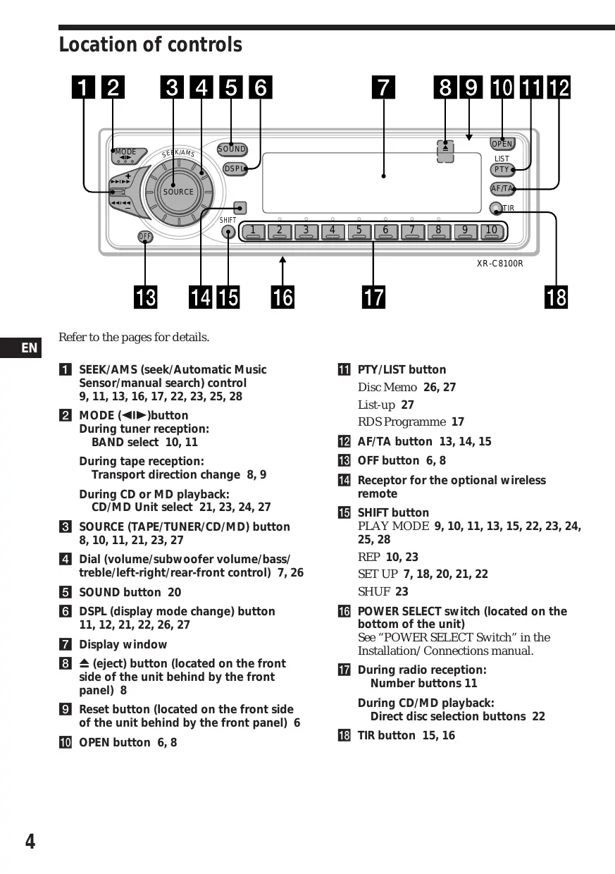 Disc Memo 26, 27 List-up 27 RDS Programme 17 !™ AF/TA button 13, 14, 15 !£ OFF button 6, 8 !¢ Receptor for the optional wireless remote !∞ SHIFT button PLAY MODE 9, 10, 11, 13, 15, 22, 23, 24, 25, 28 REP 10, 23 SET UP 7, 18, 20, 21, 22 SHUF 23 !§ POWER SELECT switch (located on the bottom of the unit) See “POWER SELECT Switch” in the Installation/Connections manual. !¶ During radio reception: Number buttons 11 During CD/MD playback: Direct disc selection buttons 22 !• TIR button 15, 16