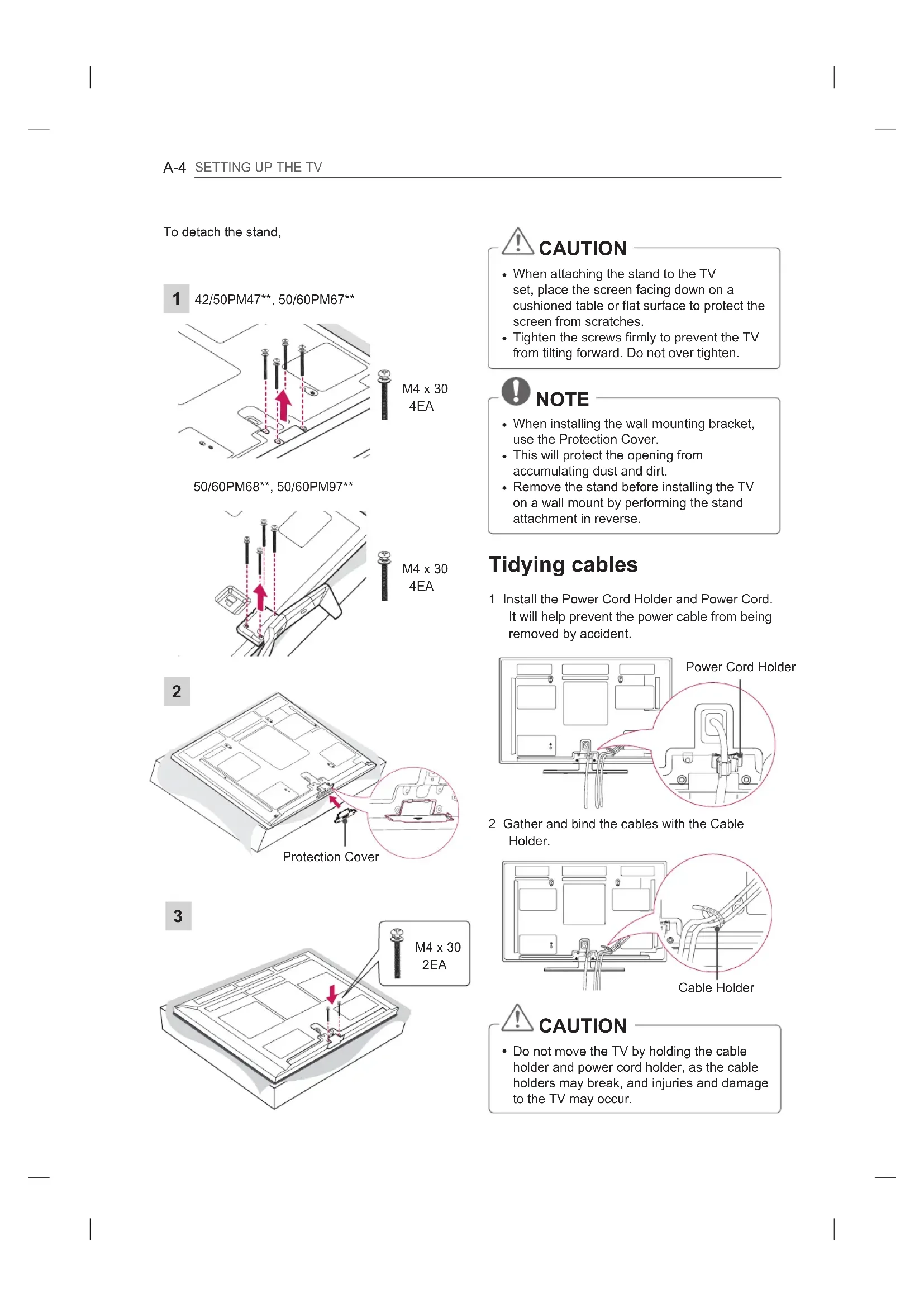 Remove the stand before installing the TV on a wall mount by performing the stand attachment in reverse. Tidying cables 1 Install the Power Cord Holder and Power Cord. It will help prevent the power cable from being removed by accident. 2 Gather and bind the cables with the Cable Holder. CAUTION