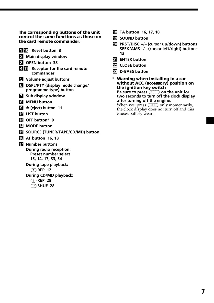 CLOSE The corresponding buttons of the unit control the same functions as those on the card remote commander. 10 Reset button 8 2 Main display window 3 OPEN button 38 4qa Receptor for the card remote commander 5 Volume adjust buttons 6 DSPL/PTY (display mode change/ programme type) button 7 Sub display window 8 MENU button 9 Z (eject) button 11 qs LIST button qd OFF button* 9 qf MODE button qg SOURCE (TUNER/TAPE/CD/MD) button qh AF button 16, 18 qj Number buttons During radio reception: Preset number select 13, 14, 17, 33, 34 During tape playback: (1) REP 12 During CD/MD playback: (1) REP 28 (2) SHUF 28 qk TA button 16, 17, 18 ql SOUND button w; PRST/DISC +/– (cursor up/down) buttons SEEK/AMS –/+ (cursor left/right) buttons wa ENTER button ws CLOSE button wd D-BASS button