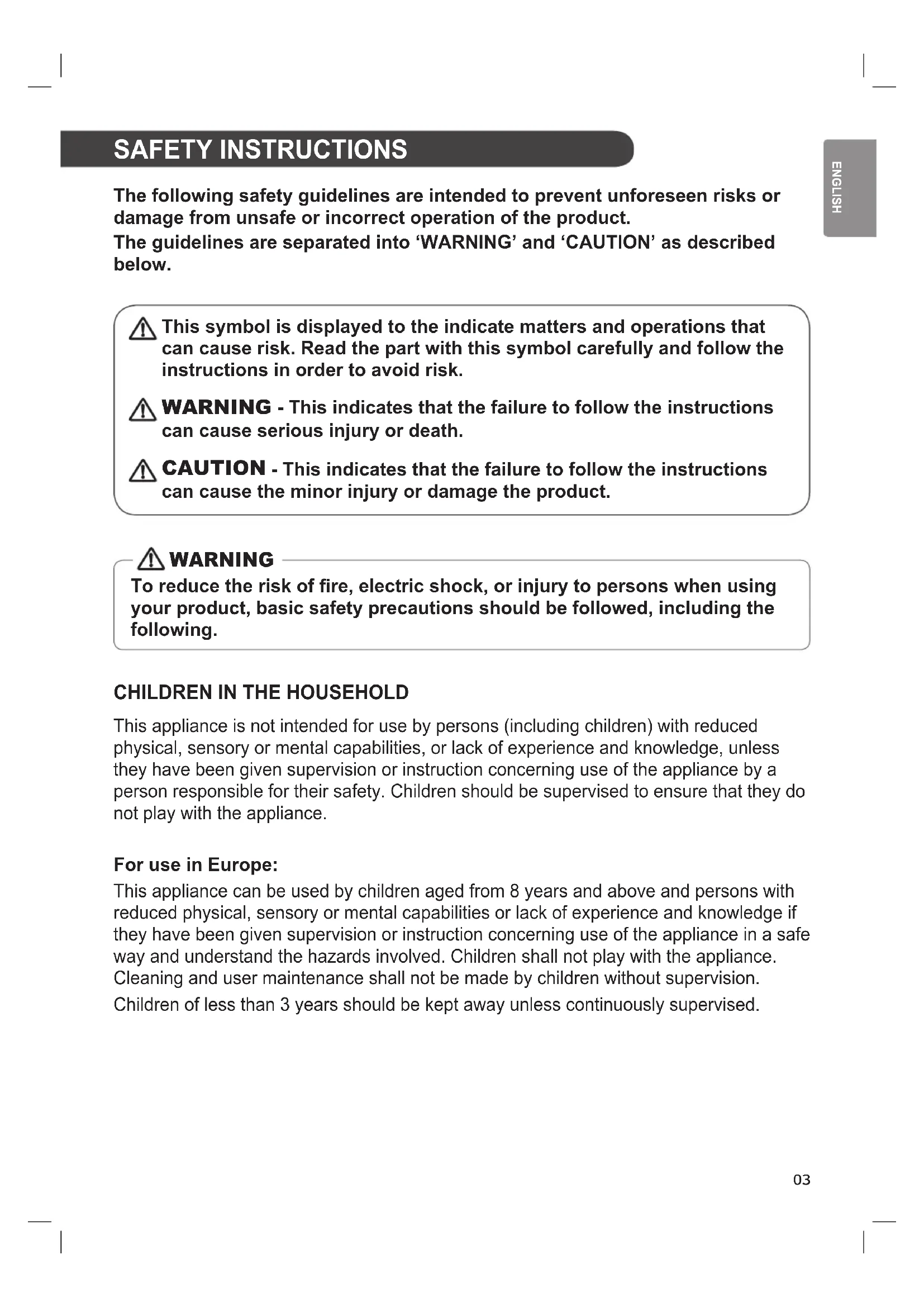 This appliance is not intended for use by persons (including children) with reduced physical, sensory or mental capabilities, or lack of experience and knowledge, unless they have been given supervision or instruction concerning use of the appliance by a person responsible for their safety. Children should be supervised to ensure that they do not play with the appliance. For use in Europe: This appliance can be used by children aged from 8 years and above and persons with reduced physical, sensory or mental capabilities or lack of experience and knowledge if they have been given supervision or instruction concerning use of the appliance in a safe way and understand the hazards involved. Children shall not play with the appliance. Cleaning and user maintenance shall not be made by children without supervision. Children of less than 3 years should be kept away unless continuously supervised.04 GROUNDING REQUIREMENTS For your safety, the information in this manual must be followed to minimize the risk of re, explosion, or electric shock, or to prevent property damage, injury to persons, or death. WARNING