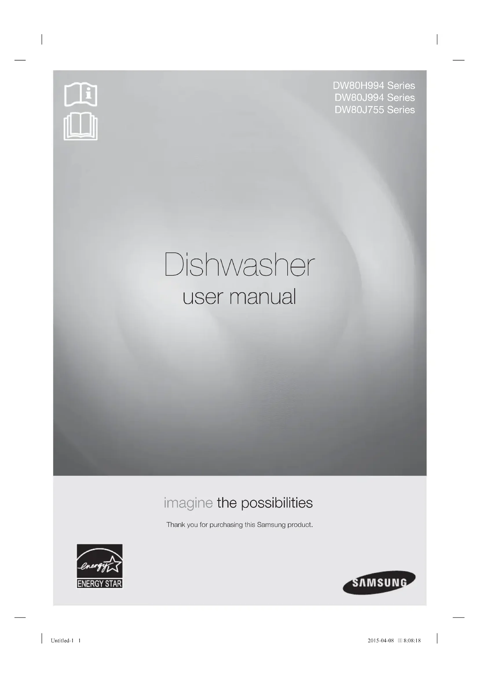Dishwasher user manual imagine the possibilities Thank you for purchasing this Samsung product. DW80H994 Series DW80J994 Series DW80J755 Series Untitled-1 1Untitled-1 1 2015-04-08 8:08:182015-04-08 8:08:18English - 2 contents