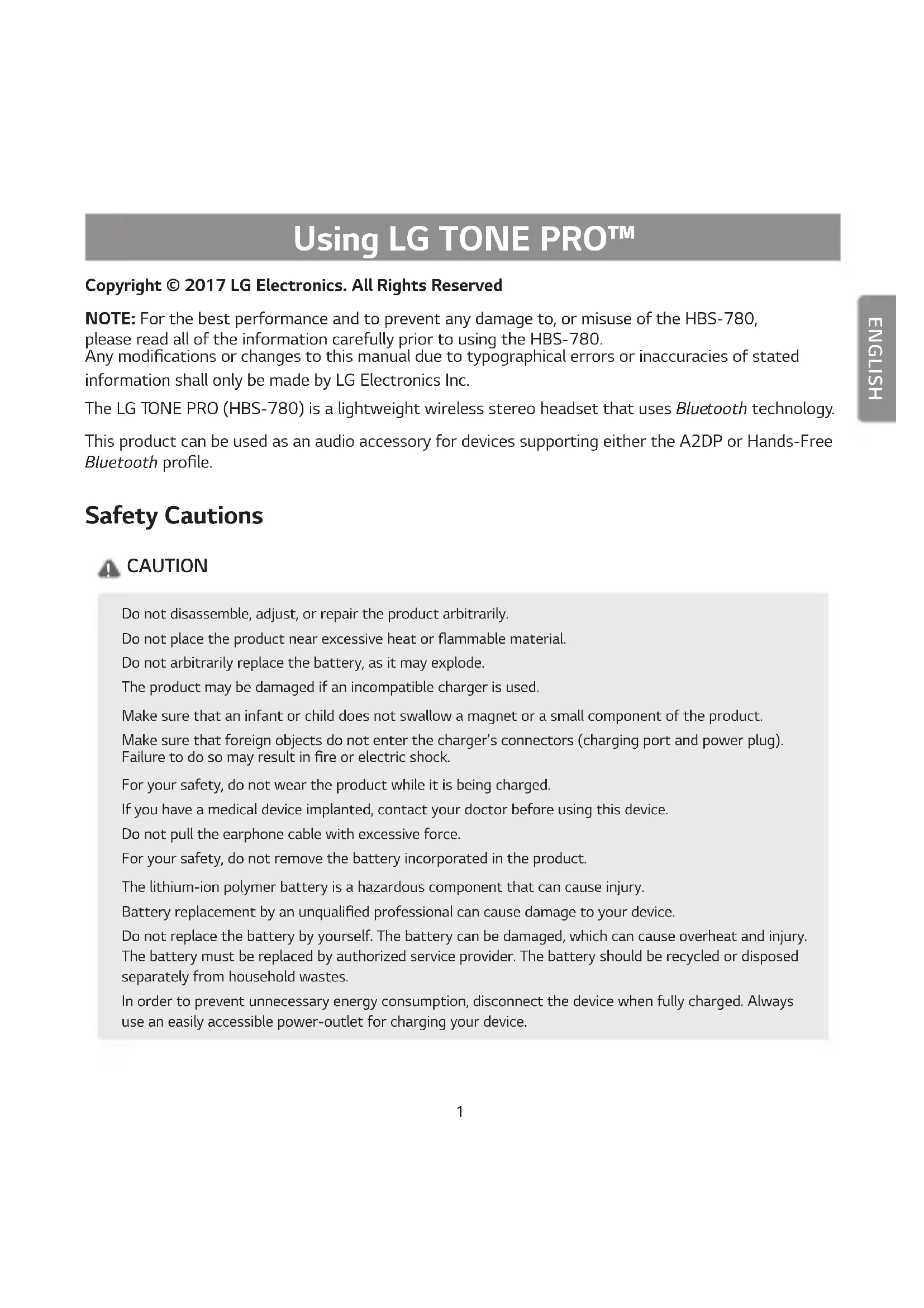 Contact ofce for compliance of this product : LG Electronics Inc. EU Representative, Krijgsman 1, 1186 DM Amstelveen, The Netherlands1 ENGLISH Using LG TONE PRO™ Copyright © 2017 LG Electronics. All Rights Reserved NOTE: For the best performance and to prevent any damage to, or misuse of the HBS-780, please read all of the information carefully prior to using the HBS-780. Any modications or changes to this manual due to typographical errors or inaccuracies of stated information shall only be made by LG Electronics Inc. The LG TONE PRO (HBS-780) is a lightweight wireless stereo headset that uses Bluetooth technology. This product can be used as an audio accessory for devices supporting either the A2DP or Hands-Free Bluetooth prole. Safety Cautions