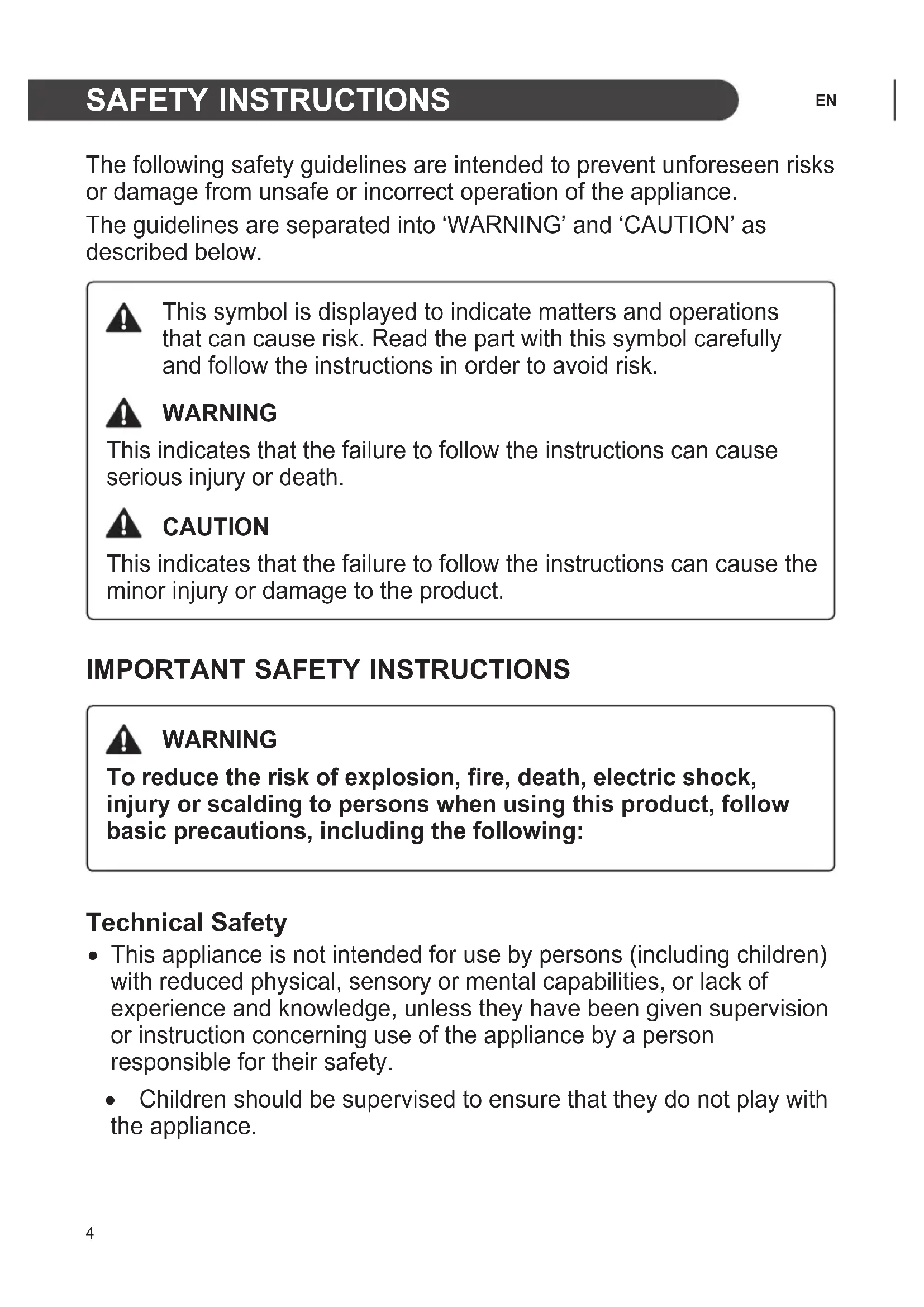 SAFETY INSTRUCTIONS The following safety guidelines are intended to prevent unforeseen risks or damage from unsafe or incorrect operation of the appliance. The guidelines are separated into ‘WARNING’ and ‘CAUTION’ as described below. This symbol is displayed to indicate matters and operations that can cause risk. Read the part with this symbol carefully and follow the instructions in order to avoid risk. WARNING This indicates that the failure to follow the instructions can cause serious injury or death. CAUTION This indicates that the failure to follow the instructions can cause the minor injury or damage to the product.