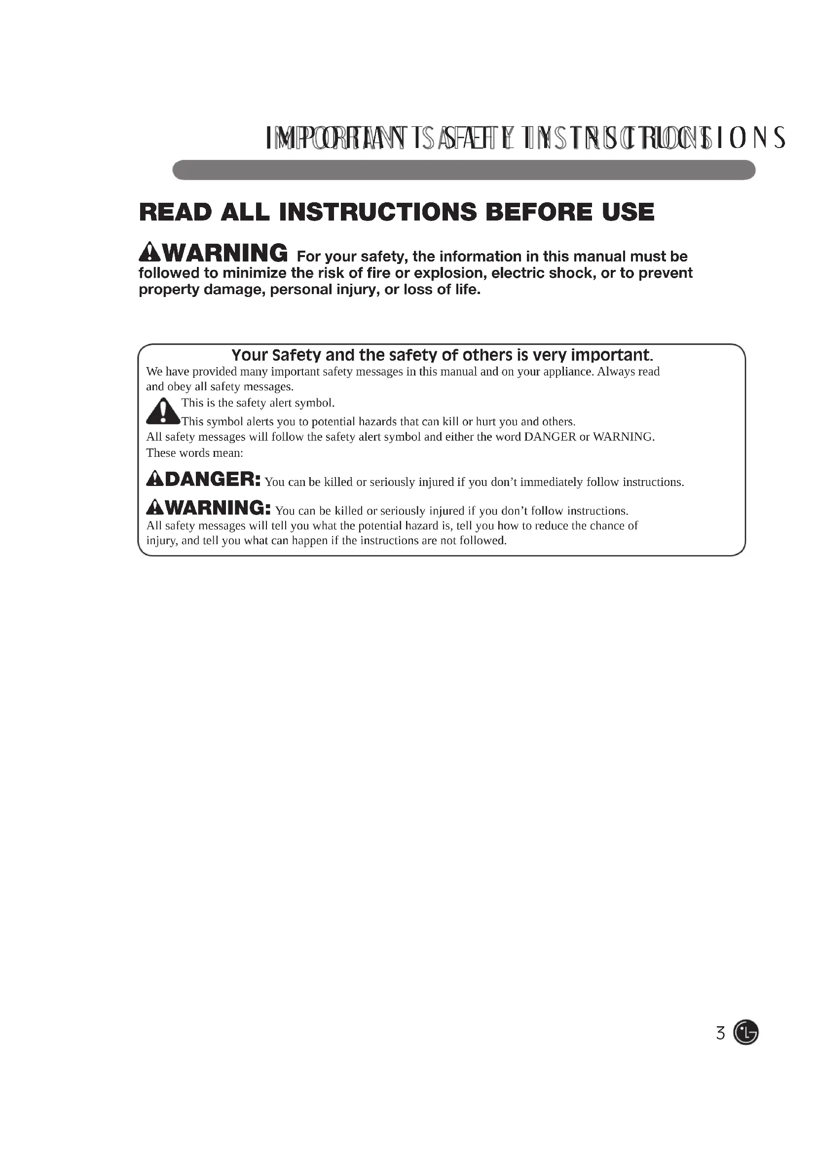 READ ALL INSTRUCTIONS BEFORE USEwWARNING For your safety, the information in this manual must be followed to minimize the risk of fi re or explosion, electric shock, or to prevent property damage, personal injury, or loss of life.