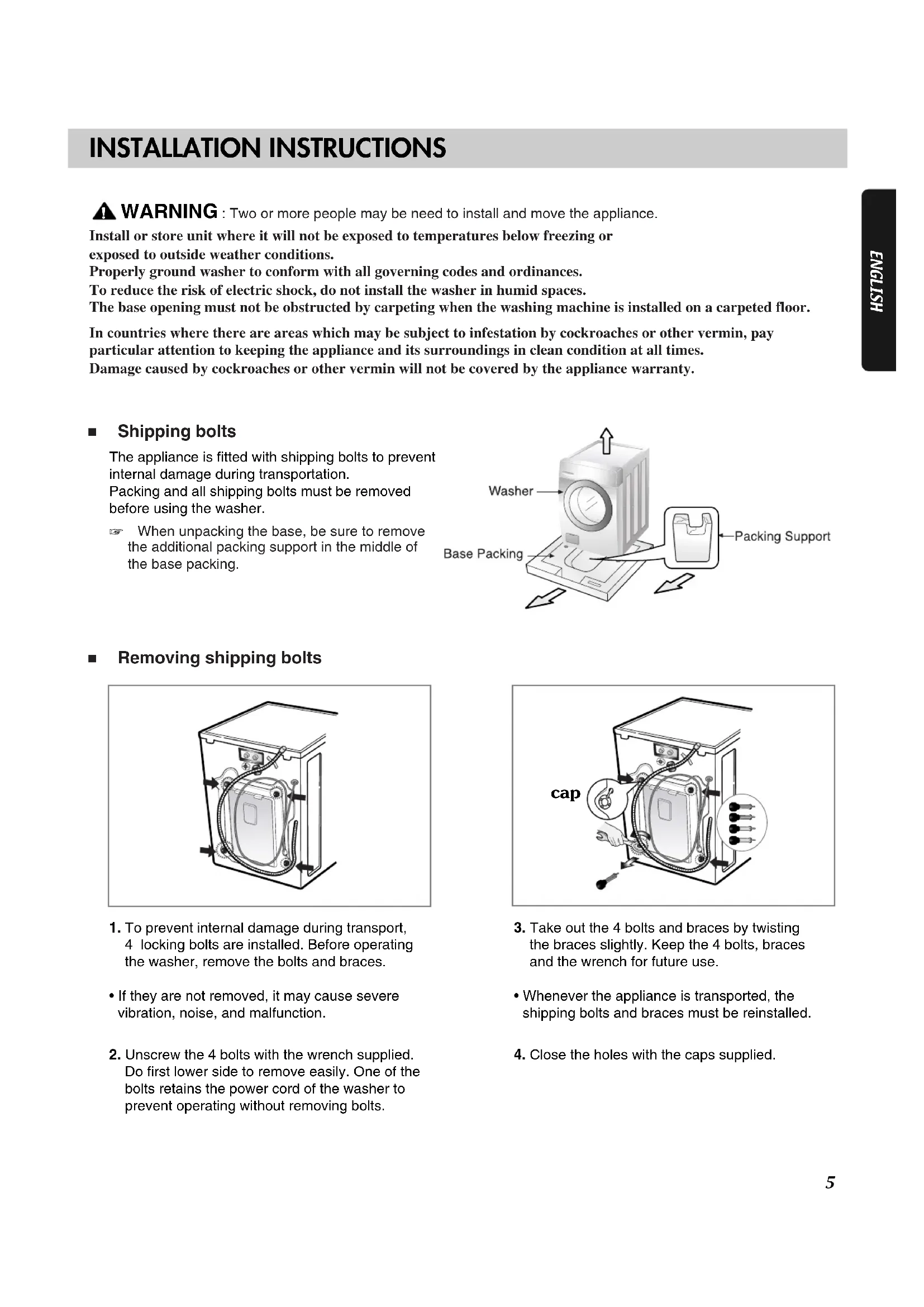 Specifications subject to change by manufacturer. Safety Cover (PLC Modem)5 INSTALLATION INSTRUCTIONS 1. To prevent internal damage during transport, 4 locking bolts are installed. Before operatingthe washer, remove the bolts and braces.• If they are not removed, it may cause severevibration, noise, and malfunction.3. Take out the 4 bolts and braces by twisting the braces slightly. Keep the 4 bolts, braces and the wrench for future use.• Whenever the appliance is transported, theshipping bolts and braces must be reinstalled. 2. Unscrew the 4 bolts with the wrench supplied.Do first lower side to remove easily. One of thebolts retains the power cord of the washer toprevent operating without removing bolts.4. Close the holes with the caps supplied.The appliance is fitted with shipping bolts to preventinternal damage during transportation.Packing and all shipping bolts must be removedbefore using the washer. When unpacking the base, be sure to removethe additional packing support in the middle ofthe base packing.: Two or more people may be need to install and move the appliance. ■ Shipping bolts Install or store unit where it will not be exposed to temperatures below freezing or exposed to outside weather conditions. Properly ground washer to conform with all governing codes and ordinances. To reduce the risk of electric shock, do not install the washer in humid spaces. The base opening must not be obstructed by carpeting when the washing machine is installed on a carpeted floor. In countries where there are areas which may be subject to infestation by cockroaches or other vermin, pay particular attention to keeping the appliance and its surroundings in clean condition at all times. Damage caused by cockroaches or other vermin will not be covered by the appliance warranty. ■ Removing shipping bolts cap ENGLISH