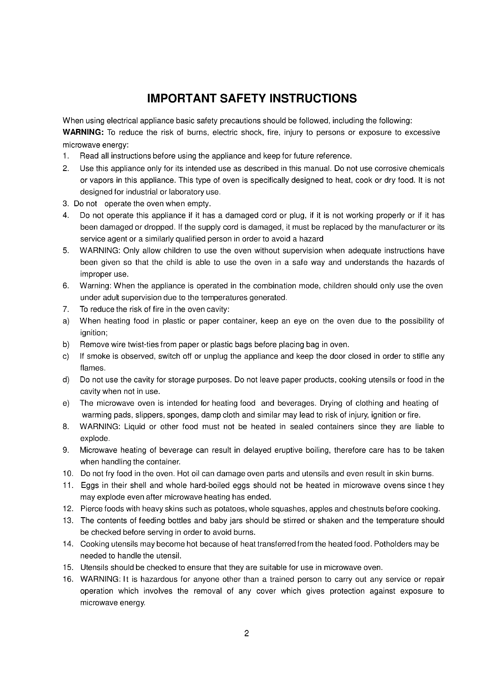 a) When heating food in plastic or paper container, keep an eye on the oven due to the possibility of ignition; b) Remove wire twist-ties from paper or plastic bags before placing bag in oven. c) If smoke is observed, switch off or unplug the appliance and keep the door closed in order to stifle any flames. d) Do not use the cavity for storage purposes. Do not leave paper products, cooking utensils or food in the cavity when not in use. e) The microwave oven is intended f or heating food and beverages. Drying of clothing and heating of warming pads, slippers, sponges, damp cloth and similar may lead to risk of injury, ignition or fire.