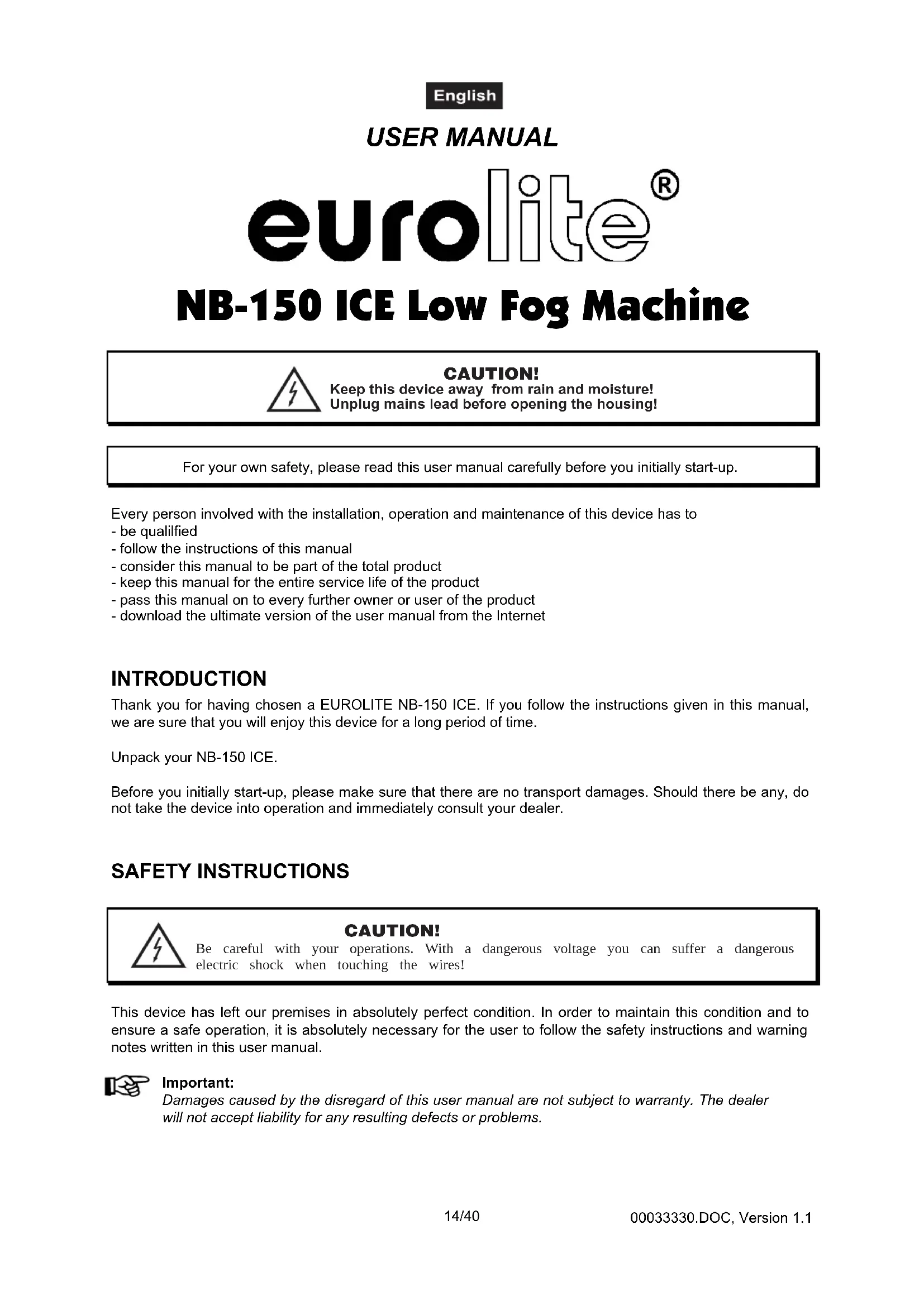 USER MANUAL NB-150 ICE Low Fog Machine CAUTION! Keepthisdeviceawayfromrainandmoisture!Unplugmainsleadbeforeopeningthehousing!For your own safety, please read this user manual carefully before you initially start-up.Every person involved with the installation, operation and maintenance of this device has to- be qualilfied- follow the instructions of this manual- consider this manual to be part of the total product- keep this manual for the entire service life of the product- pass this manual on to every further owner or user of the product- download the ultimate version of the user manual from the Internet INTRODUCTION Thank you for having chosen a EUROLITE NB-150 ICE. If you follow the instructions given in this manual,we are sure that you will enjoy this device for a long period of time.Unpack your NB-150 ICE.Before you initially start-up, please make sure that there are no transport damages. Should there be any, donot take the device into operation and immediately consult your dealer. SAFETY INSTRUCTIONS CAUTION! Becarefulwithyouroperations.Withadangerousvoltageyoucansufferadangerouselectricshockwhentouchingthewires!This device has left our premises in absolutely perfect condition. In order to maintain this condition and toensure a safe operation, it is absolutely necessary for the user to follow the safety instructions and warningnotes written in this user manual.Important:Damages caused by the disregard of this user manual are not subject to warranty. The dealerwill not accept liability for any resulting defects or problems.00033330.DOC, Version 1.1 15/40 If the device has been exposed to drastic temperature fluctuation (e.g. after transportation), do not switch it on immediately. The arising condensation water might damage your device. Leave the device switched off until it has reached room temperature. This device falls uner protection-class I. The power plug must only be plugged into a protection class I outlet.