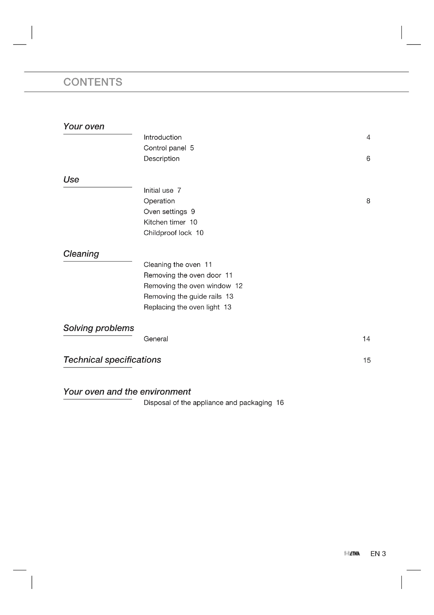 CONTENTS Your oven Introduction 4 Control panel 5 Description 6 Use Initial use 7 Operation 8 Oven settings 9 Kitchen timer 10 Childproof lock 10 Cleaning Cleaning the oven 11 Removing the oven door 11 Removing the oven window 12 Removing the guide rails 13 Replacing the oven light 13 Solving problems General 14 Technical specifications 15 Your oven and the environment Disposal of the appliance and packaging 16EN 4 Introduction Congratulations on the purchase of this Etna oven. This product is designed to offer optimum user-friendliness. The oven has a wide range of settings enabling you to select the correct cooking method every time. This manual shows how you can best use this oven. In addition to information about operating the oven, you will also find background information that may be useful when using the appliance. Please read the separate safety instructions carefully before using the appliance! Read this manual before using the appliance and keep it in a safe place for future use. Installation instructions are supplied separately. YOUR OVENEN 5 YOUR OVEN Control panel