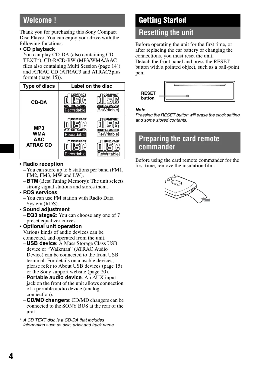 files also containing Multi Session (page 14)) and ATRAC CD (ATRAC3 and ATRAC3plus format (page 15)). Type of discs Resetting the unit Before operating the unit for the first time, or after replacing the car battery or changing the connections, you must reset the unit. Detach the front panel and press the RESET button with a pointed object, such as a ball-point pen. Label on the disc RESET button CD-DA Note Pressing the RESET button will erase the clock setting and some stored contents. MP3 WMA AAC ATRAC CD
