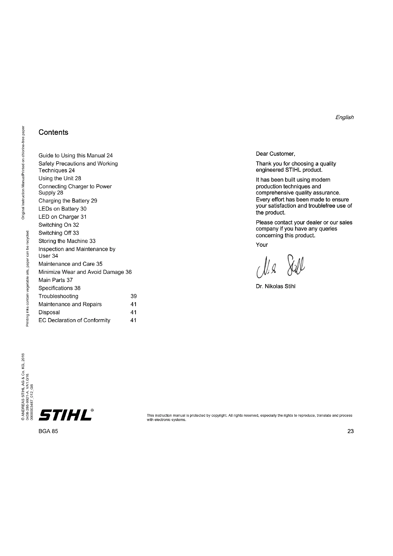 This instruction manual is protected by copyright. All rights reserved, especially the rights to reproduce, translate and process with electronic systems. Contents Dear Customer, Thank you for choosing a quality engineered STIHL product. It has been built using modern production techniques and comprehensive quality assurance. Every effort has been made to ensure your satisfaction and troublefree use of the product. Please contact your dealer or our sales company if you have any queries concerning this product. Your Dr. Nikolas Stihl Guide to Using this Manual 24 Safety Precautions and Working Techniques 24 Using the Unit 28 Connecting Charger to Power Supply 28 Charging the Battery 29 LEDs on Battery 30 LED on Charger 31 Switching On 32 Switching Off 33 Storing the Machine 33 Inspection and Maintenance by User 34 Maintenance and Care 35 Minimize Wear and Avoid Damage 36 Main Parts 37 Specifications 38 Troubleshooting 39 Maintenance and Repairs 41 Disposal 41 EC Declaration of Conformity 41BGA 85 English