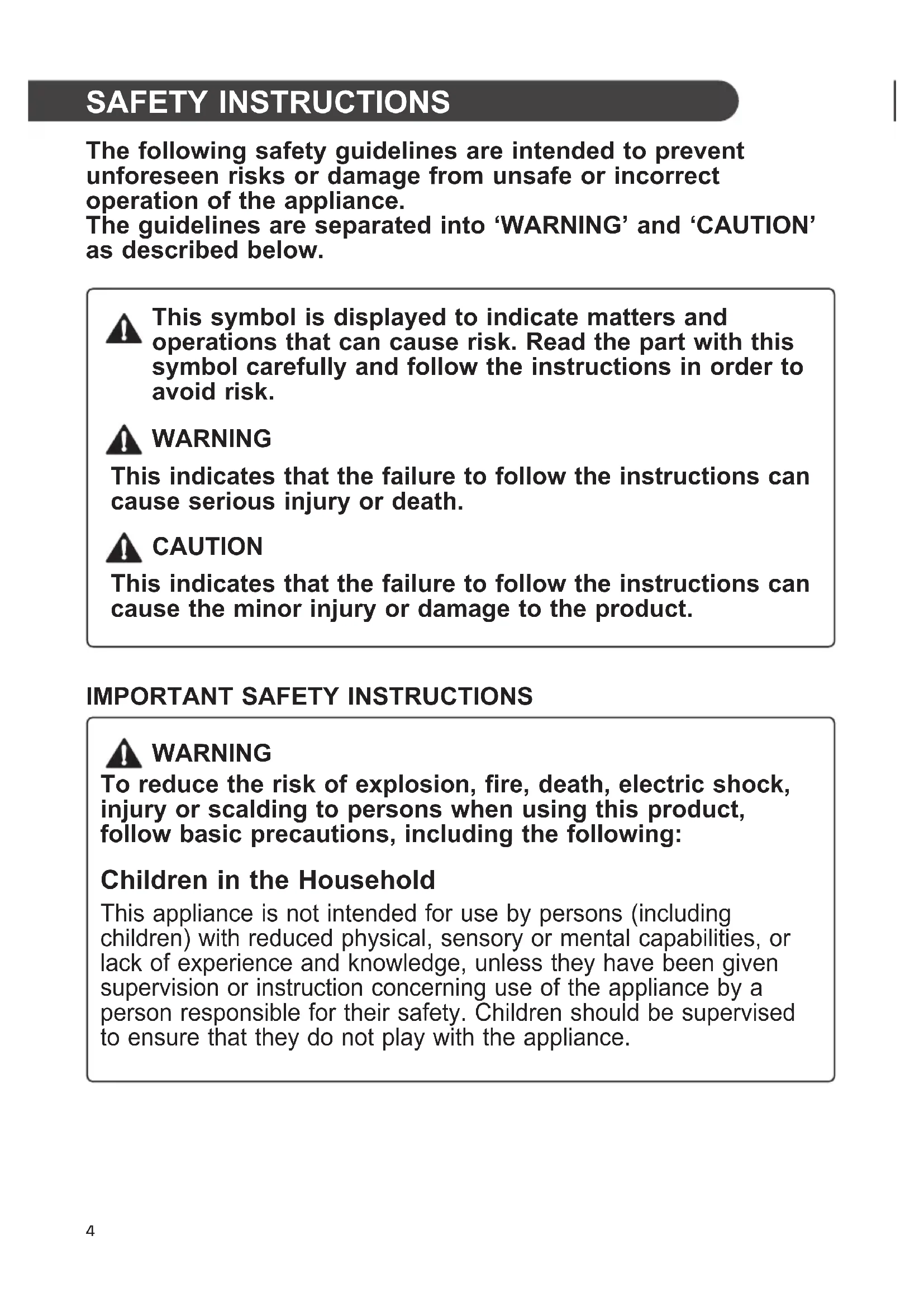WARNING To reduce the risk of explosion, fire, death, electric shock, injury or scalding to persons when using this product, follow basic precautions, including the following: Children in the Household This appliance is not intended for use by persons (including children) with reduced physical, sensory or mental capabilities, or lack of experience and knowledge, unless they have been given supervision or instruction concerning use of the appliance by a person responsible for their safety. Children should be supervised to ensure that they do not play with the appliance.5