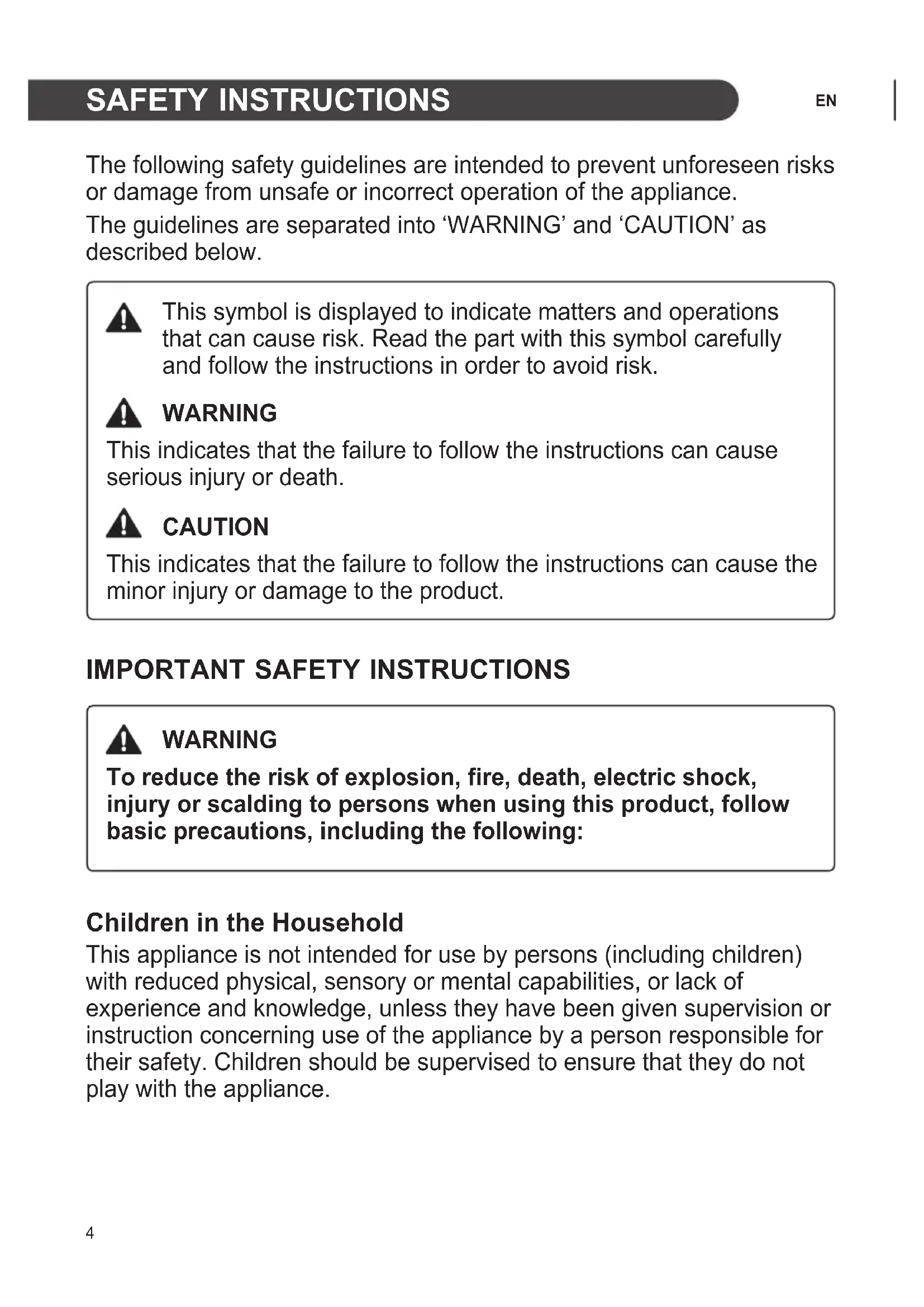 WARNING To reduce the risk of explosion, fire, death, electric shock, injury or scalding to persons when using this product, follow basic precautions, including the following: Children in the Household This appliance is not intended for use by persons (including children) with reduced physical, sensory or mental capabilities, or lack of experience and knowledge, unless they have been given supervision or instruction concerning use of the appliance by a person responsible for their safety. Children should be supervised to ensure that they do not play with the appliance.5