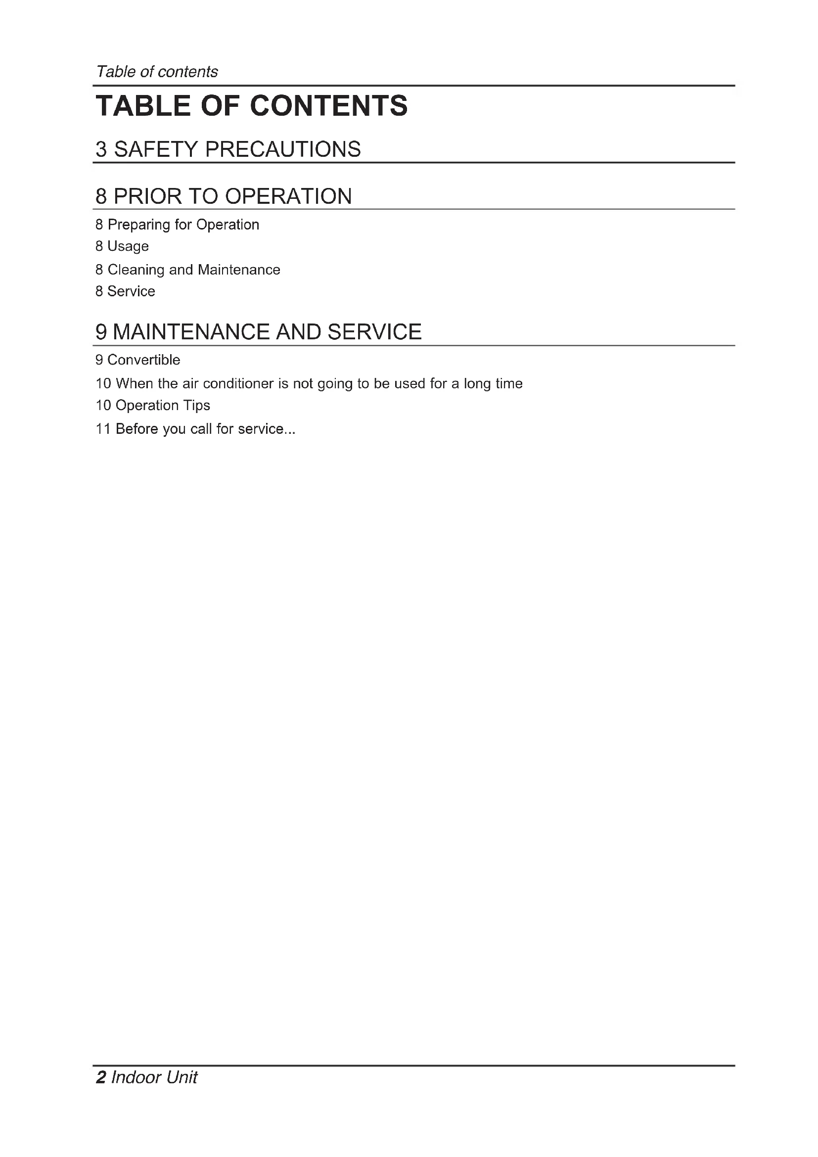 9 Convertible 10 When the air conditioner is not going to be used for a long time 10 Operation Tips 11 Before you call for service... TABLE OF CONTENTSOwner’s Manual 3 ENGLISH Safety Precautions Safety Precautions The following symbols are displayed on indoor and outdoor units Installation