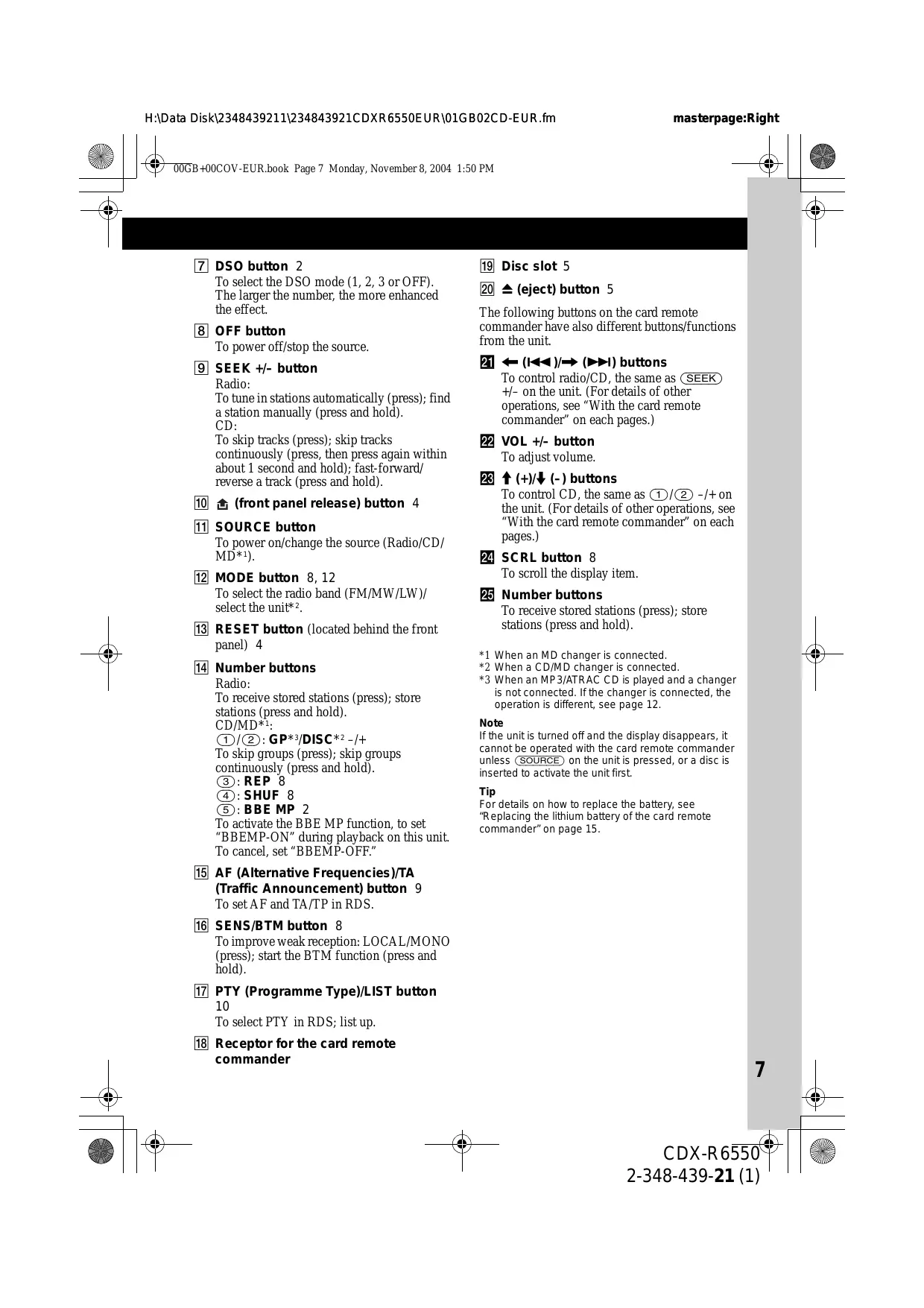 (front panel release) button 4 K SOURCE button To power on/change the source (Radio/CD/ MD*1). L MODE button 8, 12 To select the radio band (FM/MW/LW)/ select the unit*2. M RESET button (located behind the front panel) 4 N Number buttons Radio: To receive stored stations (press); store stations (press and hold). CD/MD*1: (1)/(2): GP*3/DISC*2 –/+ To skip groups (press); skip groups continuously (press and hold). (3): REP 8 (4): SHUF 8 (5): BBE MP 2 To activate the BBE MP function, to set “BBEMP-ON” during playback on this unit. To cancel, set “BBEMP-OFF.” S Disc slot 5 T Z (eject) button 5 The following buttons on the card remote commander have also different buttons/functions from the unit. wa < (.)/, (>) buttons To control radio/CD, the same as (SEEK) +/– on the unit. (For details of other operations, see “With the card remote commander” on each pages.) ws VOL +/– button To adjust volume. wd M (+)/m (–) buttons To control CD, the same as (1)/(2) –/+ on the unit. (For details of other operations, see “With the card remote commander” on each pages.) wf SCRL button 8 To scroll the display item. wg Number buttons To receive stored stations (press); store stations (press and hold). *1 When an MD changer is connected. *2 When a CD/MD changer is connected. *3 When an MP3/ATRAC CD is played and a changer is not connected. If the changer is connected, the operation is different, see page 12. Note If the unit is turned off and the display disappears, it cannot be operated with the card remote commander unless (SOURCE) on the unit is pressed, or a disc is inserted to activate the unit first. Tip For details on how to replace the battery, see “Replacing the lithium battery of the card remote commander” on page 15. O AF (Alternative Frequencies)/TA (Traffic Announcement) button 9 To set AF and TA/TP in RDS. P SENS/BTM button 8 To improve weak reception: LOCAL/MONO (press); start the BTM function (press and hold). Q PTY (Programme Type)/LIST button To select PTY in RDS; list up. R Receptor for the card remote commander