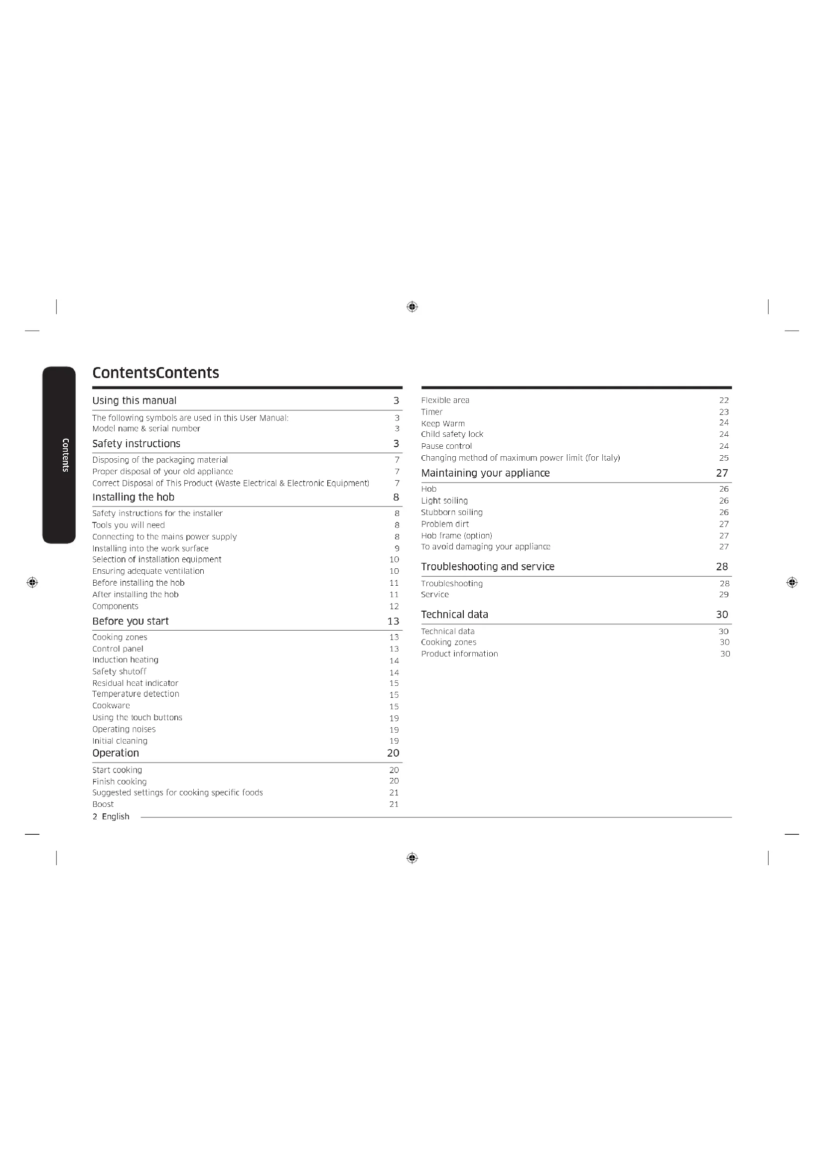 Induction Hob User manual NZ64R3747RK / NZ64R3747BK2 English Contents ContentsContents Using this manual 3 The following symbols are used in this User Manual: 3 Model name & serial number 3 Safety instructions 3 Disposing of the packaging material 7 Proper disposal of your old appliance 7 Correct Disposal of This Product (Waste Electrical & Electronic Equipment) 7 Installing the hob 8 Safety instructions for the installer 8 Tools you will need 8 Connecting to the mains power supply 8 Installing into the work surface 9 Selection of installation equipment Ensuring adequate ventilation Before installing the hob After installing the hob Components