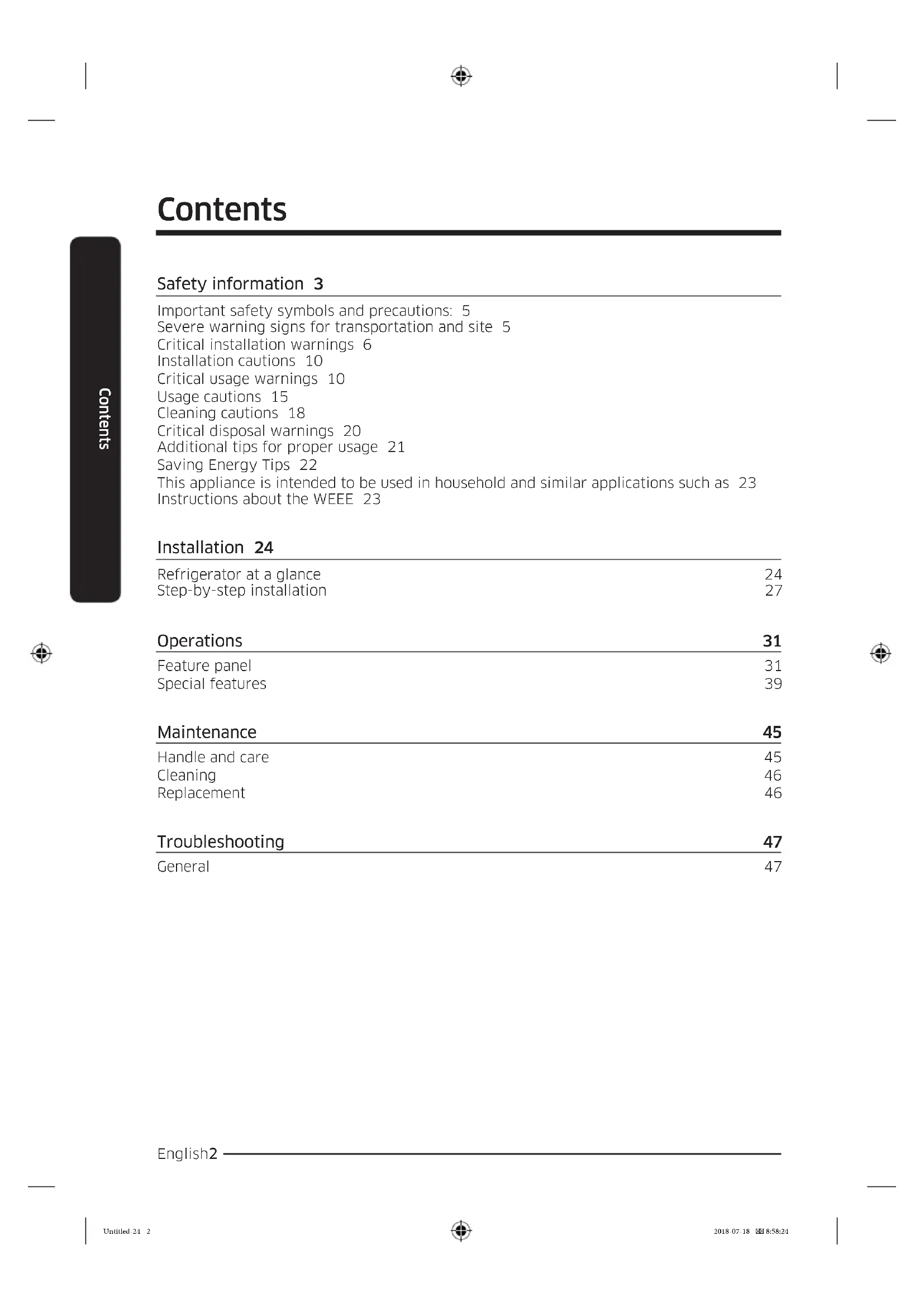 Refrigerator User manual Free Standing Appliance Untitled-24 1 2018-07-18 8:58:24English2 Contents Contents Safety information 3 Important safety symbols and precautions: 5 Severe warning signs for transportation and site 5 Critical installation warnings 6 Installation cautions 10 Critical usage warnings 10 Usage cautions 15 Cleaning cautions 18 Critical disposal warnings 20 Additional tips for proper usage 21 Saving Energy Tips 22 This appliance is intended to be used in household and similar applications such as 23 Instructions about the WEEE 23 Installation 24 Refrigerator at a glance 24 Step-by-step installation 27 Operations 31 Feature panel 31 Special features 39 Maintenance 45 Handle and care 45 Cleaning 46 Replacement 46 Troubleshooting 47 General 47 Untitled-24 2 2018-07-18 8:58:24English 3 Safety information