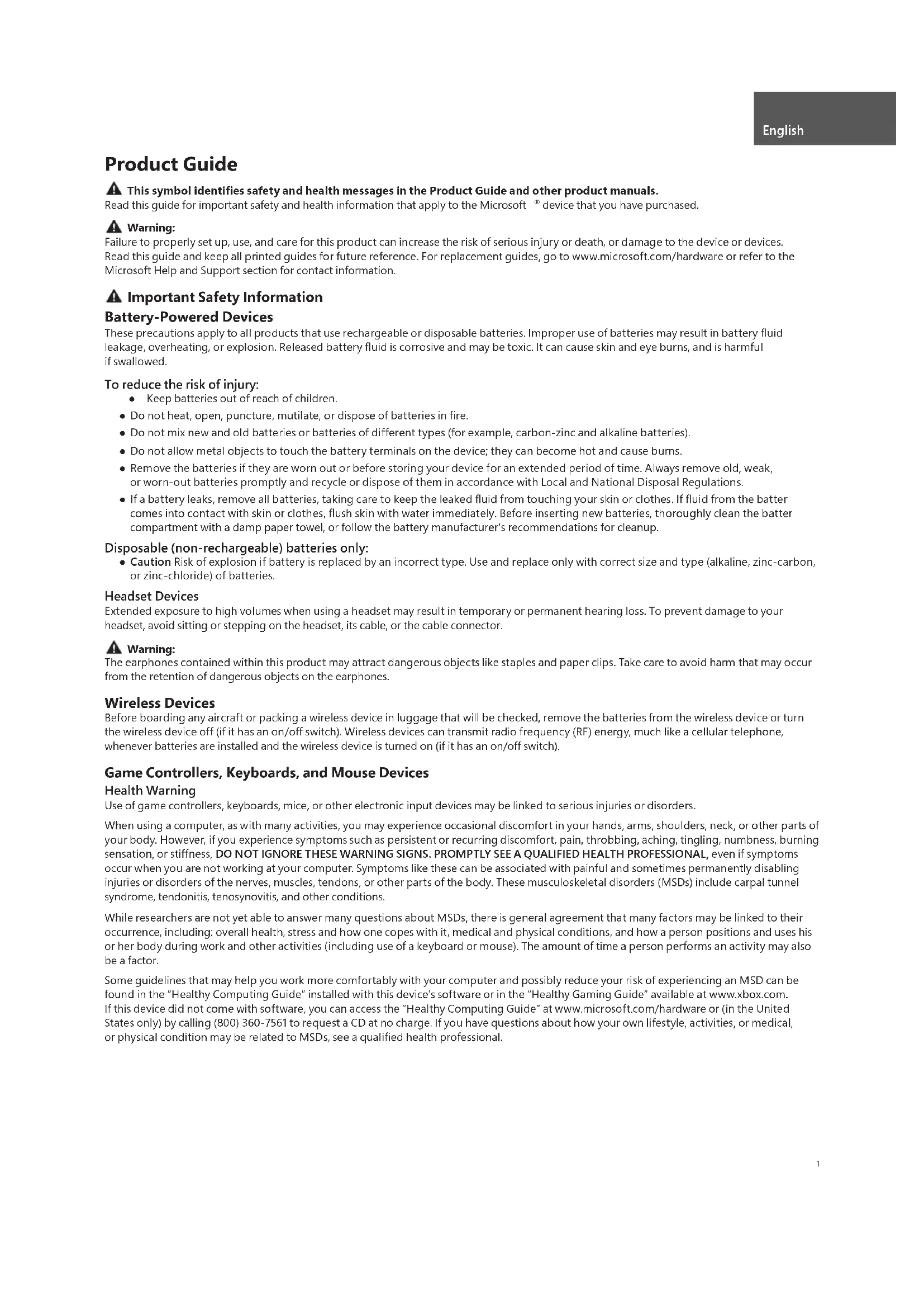Failure to properly set up, use, and care for this product can increase the risk of serious injury or death, or damage to the device or devices. Read this guide and keep all printed guides for future reference. For replacement guides, go to www.microsoft.com/hardware or refer to the Microsoft Help and Support section for contact information. Important Safety Information Battery-Powered Devices These precautions apply to all products that use rechargeable or disposable batteries. Improper use of batteries may result in battery fl uid leakage, overheating, or explosion. Released battery fl uid is corrosive and may be toxic. It can cause skin and eye burns, and is harmful if swallowed. To reduce the risk of injury: ● Keep batteries out of reach of children. ● Do not heat, open, puncture, mutilate, or dispose of batteries in fire. ● Do not mix new and old batteries or batteries of different types (for example, carbon-zinc and alkaline batteries). ● Do not allow metal objects to touch the battery terminals on the device; they can become hot and cause burns. ● Remove the batteries if they are worn out or before storing your device for an extended period of time. Always remove old, weak, or worn-out batteries promptly and recycle or dispose of them in accordance with Local and National Disposal Regulations. ● If a battery leaks, remove all batteries, taking care to keep the leaked fluid from touching your skin or clothes. If fluid from the batter comes into contact with skin or clothes, flush skin with water immediately. Before inserting new batteries, thoroughly clean the batter compartment with a damp paper towel, or follow the battery manufacturer’s recommendations for cleanup. Disposable (non-rechargeable) batteries only: ● Caution Risk of explosion if battery is replaced by an incorrect type. Use and replace only with correct size and type (alkaline, zinc-carbon, or zinc-chloride) of batteries. Headset Devices Extended exposure to high volumes when using a headset may result in temporary or permanent hearing loss. To prevent damage to your headset, avoid sitting or stepping on the headset, its cable, or the cable connector.