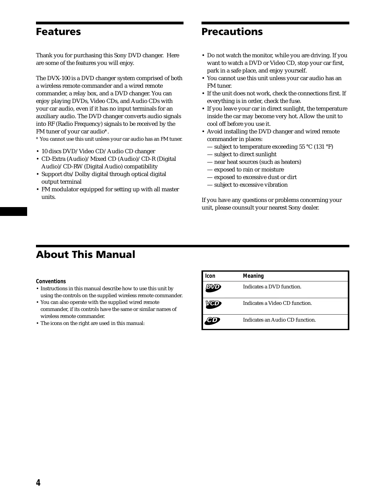 - Avoid installing the DVD changer and wired remote commander in places: — subject to temperature exceeding 55 °C (131 °F) — subject to direct sunlight — near heat sources (such as heaters) — exposed to rain or moisture — exposed to excessive dust or dirt — subject to excessive vibration The DVX-100 is a DVD changer system comprised of both a wireless remote commander and a wired remote commander, a relay box, and a DVD changer. You can enjoy playing DVDs, Video CDs, and Audio CDs with your car audio, even if it has no input terminals for an auxiliary audio. The DVD changer converts audio signals into RF (Radio Frequency) signals to be received by the FM tuner of your car audio*.