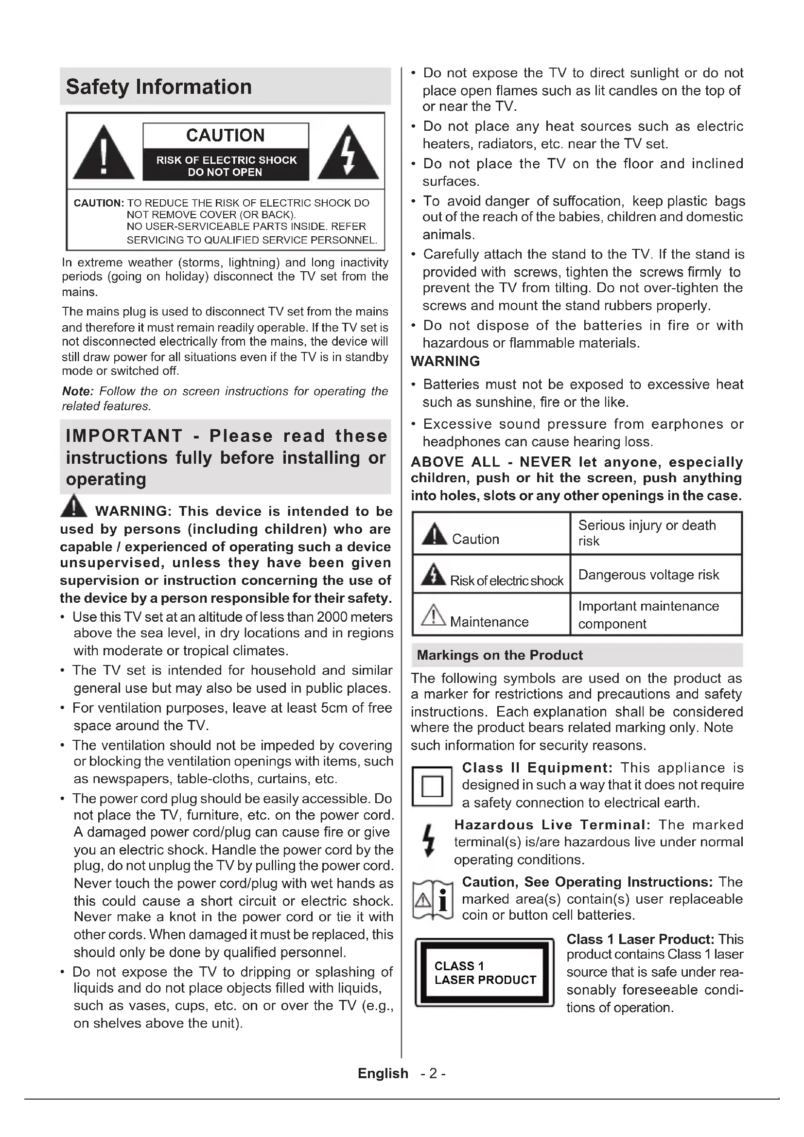 Class 1 Laser Product: This product contains Class 1 laser source that is safe under rea- sonably foreseeable condi- tions of operation.English - 3 - WARNING Do not ingest the battery, Chemical Burn Hazard This product or the accessories supplied with the prod- uct may contain a coin/button cell battery. If the coin/ button cell battery is swallowed, it can cause severe internal burns in just 2 hours and can lead to death. Keep new and used batteries away from children. If the battery compartment does not close securely, stop using the product and keep it away from children. If you think batteries might have been swallowed or placed inside any part of the body, seek immediate medical attention. – – – – – – – – – – – – A television may fall, causing serious personal injury or death. Many injuries, particularly to children, can be avoided by taking simple precautions such as: