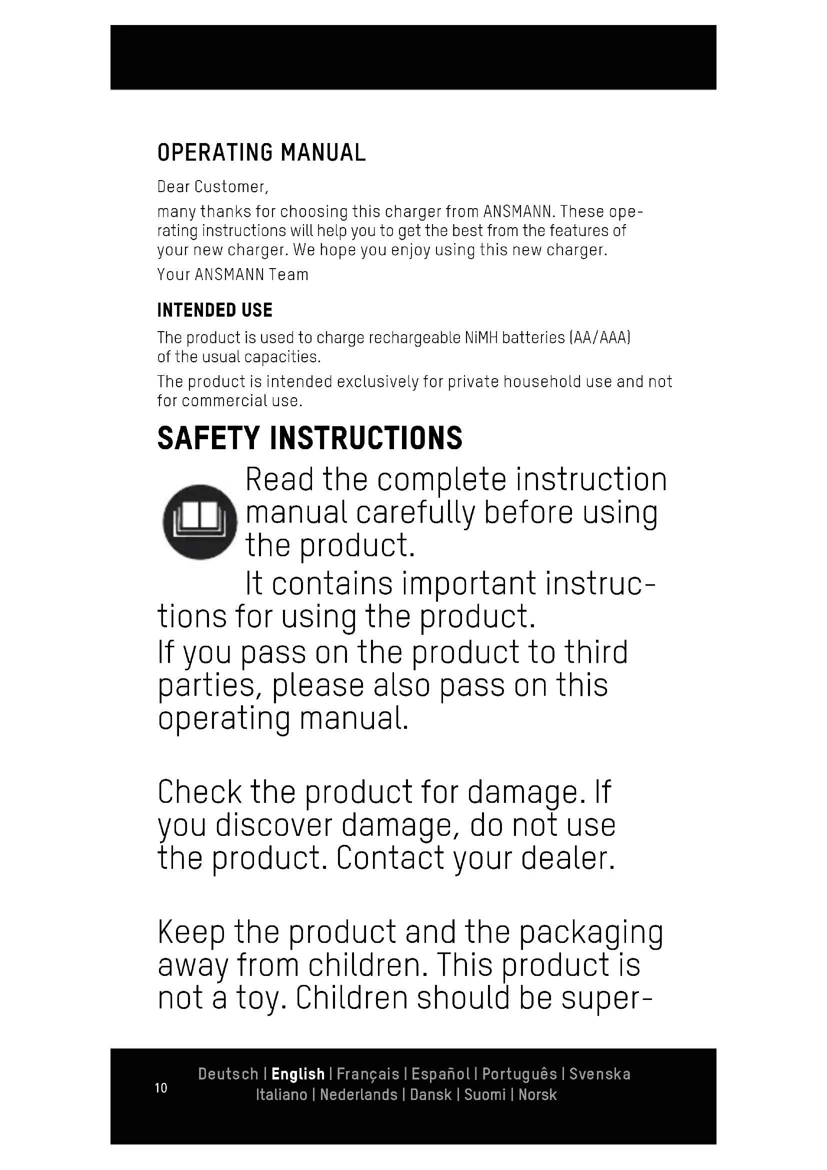 Cleaning Disconnect the power supply to the product and remove all batteries before cleaning. Only use a soft, dry or slightly damp cloth for cleaning (if necessary, add a little mild washing-up liquid). Never use abrasives or solvents for cleaning. TECHNICAL DATA Power source USB 5V, min. 1A for fastest charging, max. 2.4A Charging slots 2 Charge current AA: 800mA / AAA: 400mA Trickle charge current AA: 13mA / AAA: 6.5mA15 Deutsch | English | Français | Español | Português | Svenska Italiano | Nederlands | Dansk | Suomi | Norsk Suitable battery types (different types or capacities can be combined) Number of cells Batterie size (NiMH) Max. capacity 1-2 Mignon AA 3000 mAh Micro AAA 1100 mAh Charging times Typ Capacity approx. Charge time Charge current Micro AAA 1000 mAh 3 h 400 mA 800 mAh 2,4 h Mignon AA 2650 mAh 4 h 800 mA 2500 mAh 3,75 h 2100 mAh 3 h 1300 mAh 2 h DISPOSAL Dispose of the product in accordance with legal provisions. The "waste bin" symbol indicates that, in the EU, it is not permitted to dispose of electrical equipment in household waste. Use the return and collection systems in your area or contact the retailer from whom you purchased the product. Batteries and rechargeable batteries are special waste and shall not be disposed of in the normal household waste. Always hand used batteries and rechargeable batteries in to the collection point intended for this. In this way you will fulfil your legal obligations and contribute to environmental protection. LIABILITY DISCLAIMER The information contained within these operating instructions can be changed without prior notification. ANSMANN accepts no liability for direct, indirect, incidental or other damage or consequential damage arising though improper handling or through disregard of the information contained within these operating instructions. We16 accept no liability or warranty claims or guarantee claims in the event of incorrect use of the product. WARRANTY NOTICE The device has a three-year guarantee. The guarantee does not apply to damage to the device arising through a failure to comply with the operating instructions. Your statutory warranty rights are not affected by this. You can find our warranty conditions online at: www. ansmann.de Subject to technical changes. We assume no liability for printing errors. The product complies with the requirements from the relevant EU directives. Deutsch | English | Français | Español | Português | Svenska Italiano | Nederlands | Dansk | Suomi | Norsk17