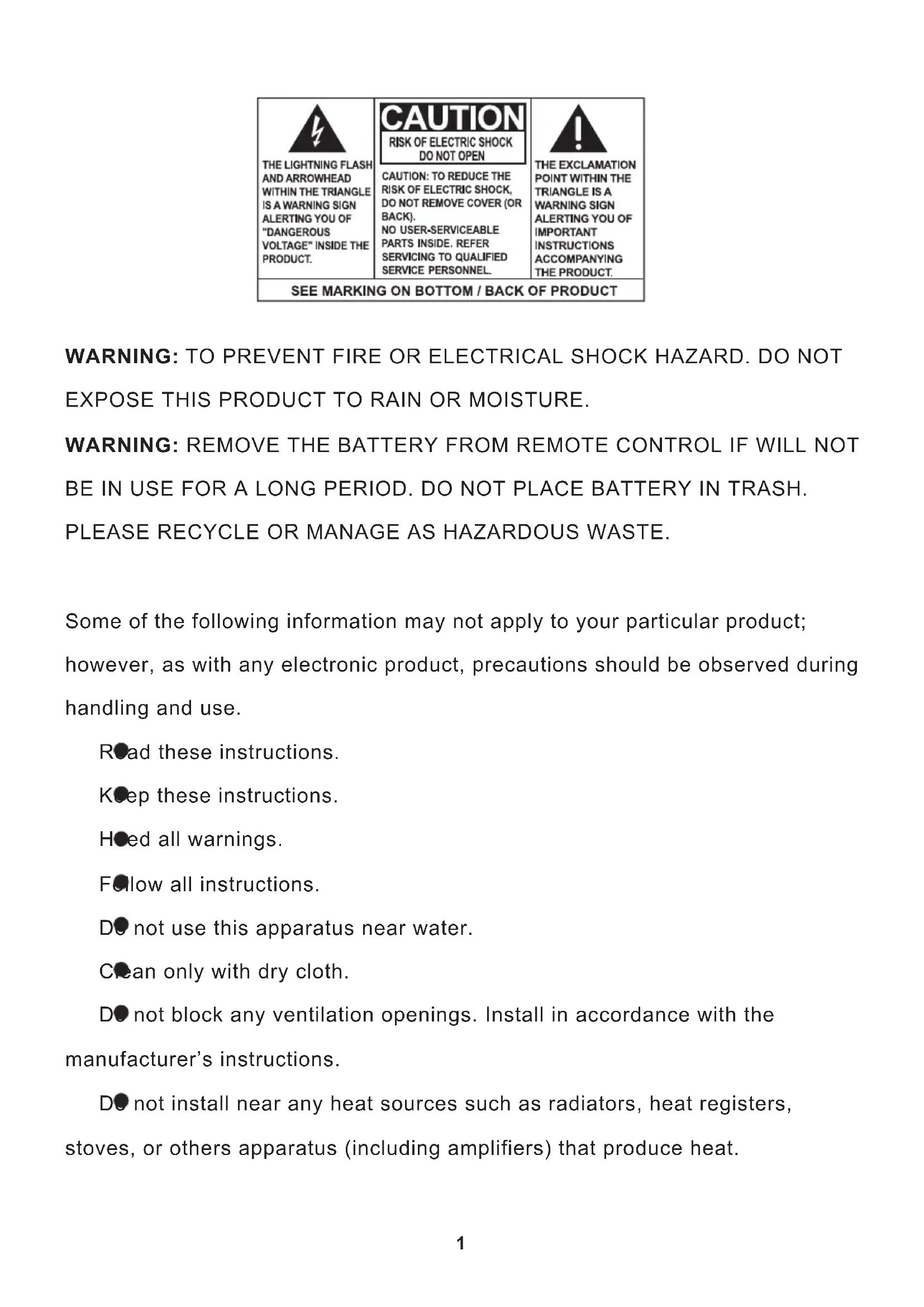 BE IN USE FOR A LONG PERIOD. DO NOT PLACE BATTERY IN TRASH. PLEASE RECYCLE OR MANAGE AS HAZARDOUS WASTE. Some of the following information may not apply to your particular product; however, as with any electronic product, precautions should be observed during handling and use. Read these instructions. Keep these instructions. Heed all warnings. Follow all instructions. Do not use this apparatus near water. Clean only with dry cloth. Do not block any ventilation openings. Install in accordance with the manufacturer’s instructions. Do not install near any heat sources such as radiators, heat registers, stoves, or others apparatus (including amplifiers) that produce heat. 1Do not defeat the safety purpose of the polarized or grounding plug. A polarized plug has two blades with one wider than the other. A grounding plug has two blades and a third grounding prong. The wide blade or the third prong is provided for your safety. If the provided plug does not fit into your outlet, consult an electrician for replacement of the obsolete outlet. Protect the power cord from being walked on or pinched particularly at plugs, convenience receptacles, and point where they exit from the apparatus. Only use attachments/accessories specified by the manufactured by the manufacturer. Use only with the cart, stand, tripod, bracket, or table specified by the manufacturer, or sold with the apparatus. When a cart is used, use caution when moving the cart/apparatus combination to avoid injury from tip-over. Unplug this apparatus during lightning storms or when unused for long periods of time. Refer all servicing to qualified service personnel. Servicing is required when the apparatus has been damaged in any way, such as power-supply cord or plug is damaged, liquid has been spilled or objects have fallen into the apparatus, the apparatus has been exposed to rain or moisture has been exposed to rain or moisture, does not operate normally, or has been dropped.