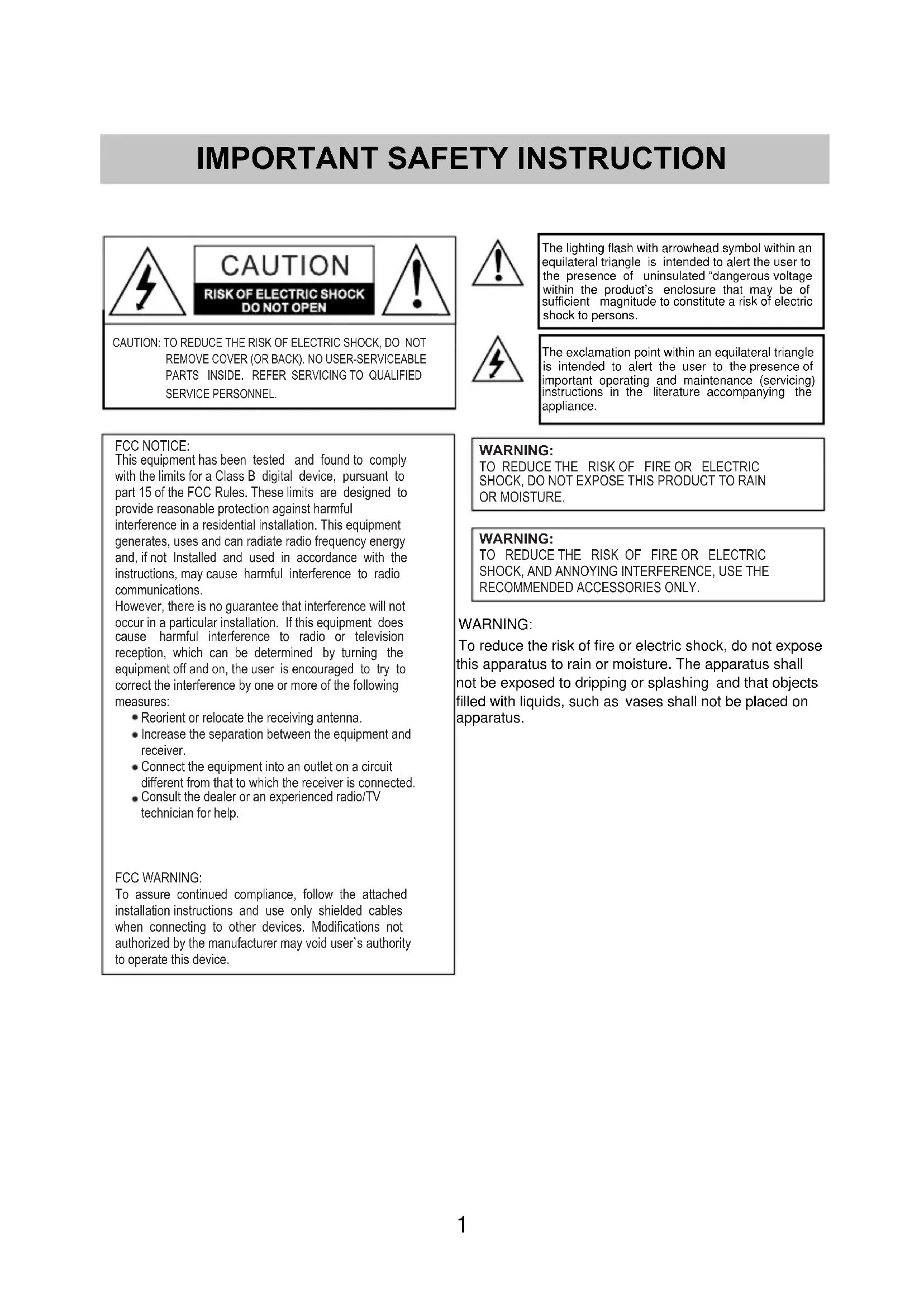 To reduce the risk of fire or electric shock, do not expose this apparatus to rain or moisture. The apparatus shall not be exposed to dripping or splashing and that objects filled with liquids, such as vases shall not be placed on apparatus. The lighting flash with arrowhead symbol within an equilateral triangle is intended to alert the user to the presence of uninsulated “dangerous voltage within the product’s enclosure that may be of sufficient magnitude to constitute a risk of electric shock to persons. The exclamation point within an equilateral triangle is intended to alert the user to the presence of important operating and maintenance (servicing) instructions in the literature accompanying the appliance.
