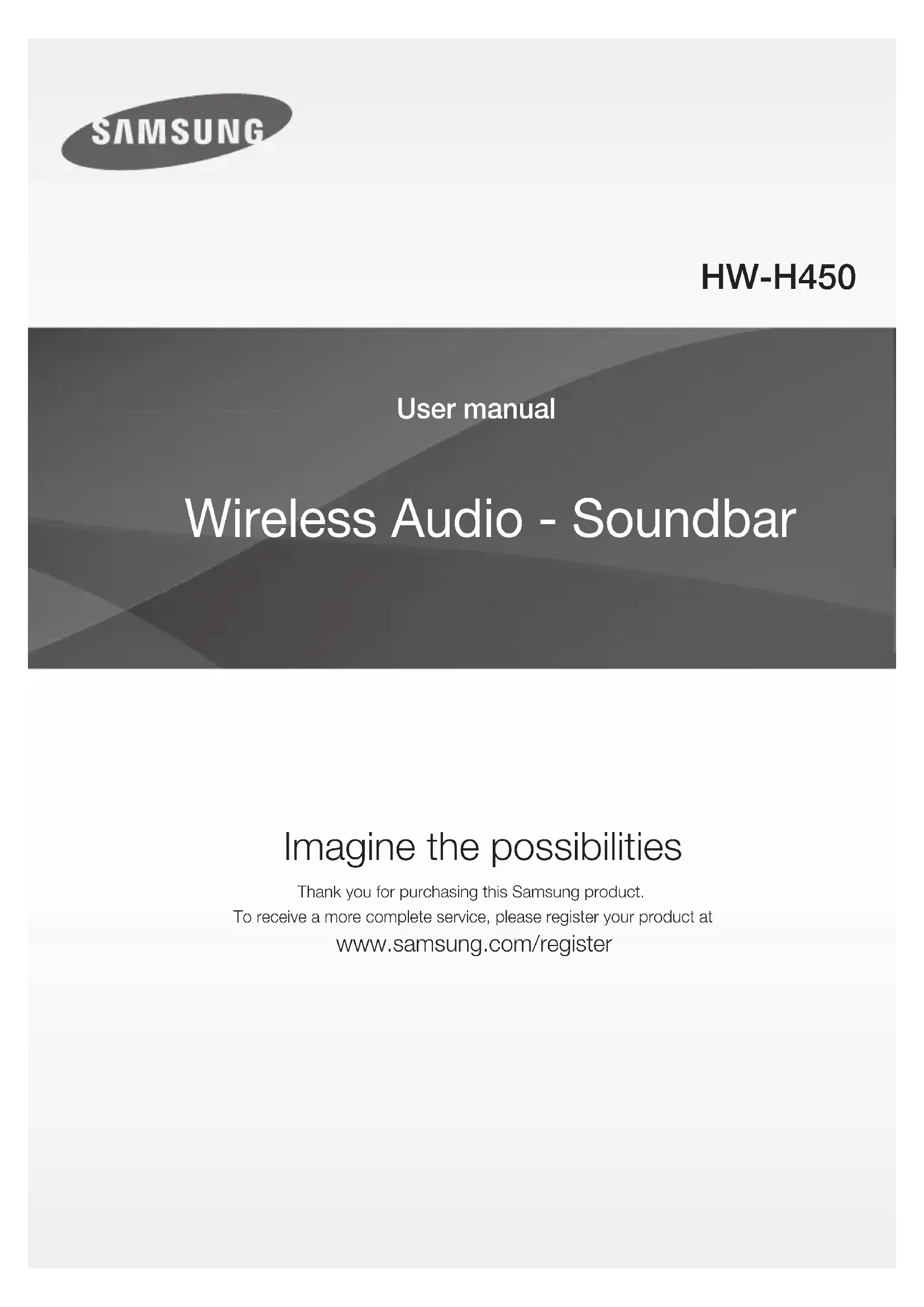 Wireless Audio - Soundbar Imagine the possibilities Thank you for purchasing this Samsung product. To receive a more complete service, please register your product at www.samsung.com/register User manual HW-H450 HW-H450_EUR_ENG_141105.indd 1HW-H450_EUR_ENG_141105.indd 1 2014-11-05 3:43:542014-11-05 3:43:542 FEATURES FEATURES TV SoundConnect TV SoundConnect lets you listen to audio from your TV on your Soundbar via a Bluetooth connection and lets you control the sound. HDMI HDMI transmits video and audio signals simultaneously, and provides a clearer picture. The unit is also equipped with the ARC function which lets you listen to sound from your TV through the Soundbar via an HDMI cable. This function is only available if you connect the unit to an ARC compliant TV. 3D SOUND The 3D SOUND feature adds depth and spaciousness to your listening experience. Wireless Subwoofer Samsung’s wireless module does away with cables running between the main unit and the subwoofer. Instead, the subwoofer connects to a compact wireless module that communicates with the main unit. Special Sound Effects You can select different Sound Effects - MUSIC / VOICE / SPORTS / CINEMA / STANDARD (Original Sound) - depending on the type of content you want to enjoy. Multi-function Remote Control You can use the supplied remote control to control various operations with the simple press of a button. USB Host Support You can connect and play music files from external USB storage devices such as MP3 players, USB flash memory, etc. using the Soundbar's USB HOST function. Bluetooth Function You can connect a Bluetooth device to the Soundbar and enjoy music with high quality stereo sound, all without wires! LICENSES Manufactured under license from Dolby Laboratories. Dolby and the double-D symbol are trademarks of Dolby Laboratories. For DTS patents, see http://patents.dts.com. Manufactured under license from DTS Licensing Limited. DTS, the Symbol, & DTS and the Symbol together are registered trademarks, and DTS 2.0 Channel is a trademark of DTS, Inc. © DTS, Inc. All Rights Reserved. The terms HDMI and HDMI High-Definition Multimedia Interface, and the HDMI Logo are trademarks or registered trademarks of HDMI Licensing LLC in the United States and other countries. HW-H450_EUR_ENG_141105.indd 2HW-H450_EUR_ENG_141105.indd 2 2014-11-05 3:44:062014-11-05 3:44:063 ENG SAFETY INFORMATION SAFETY INFORMATION SAFETY WARNINGS TO REDUCE THE RISK OF ELECTRIC SHOCK, DO NOT REMOVE THE COVER (OR BACK). NO USER-SERVICEABLE PARTS ARE INSIDE. REFER SERVICING TO QUALIFIED SERVICE PERSONNEL. CAUTION RISK OF ELECTRIC SHOCK DO NOT OPEN